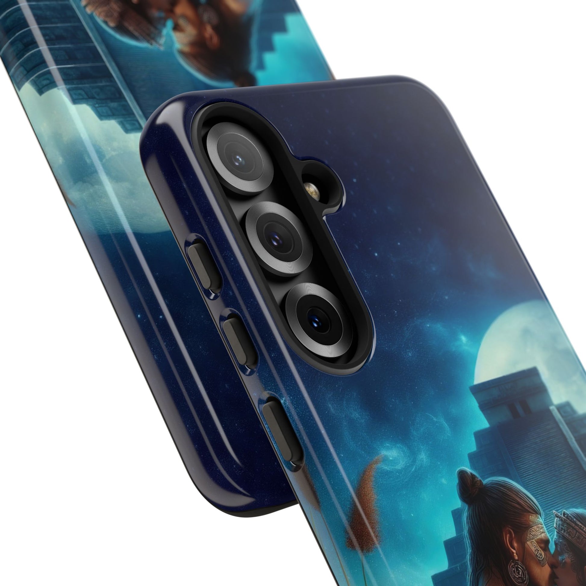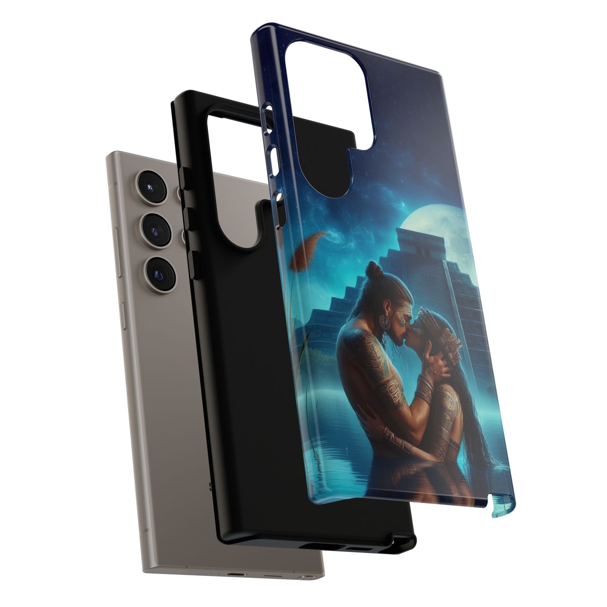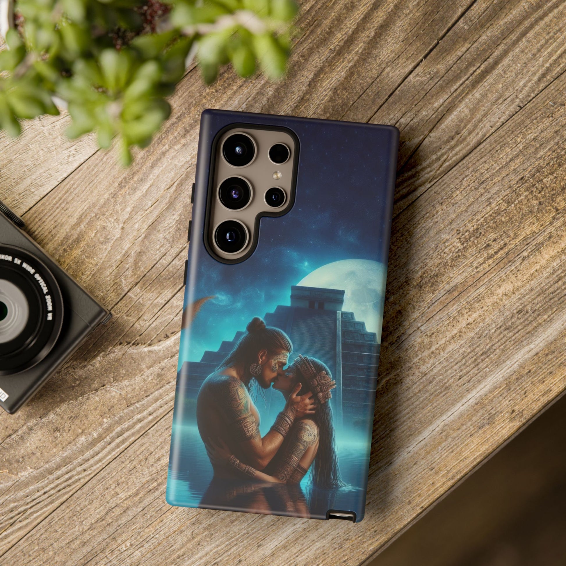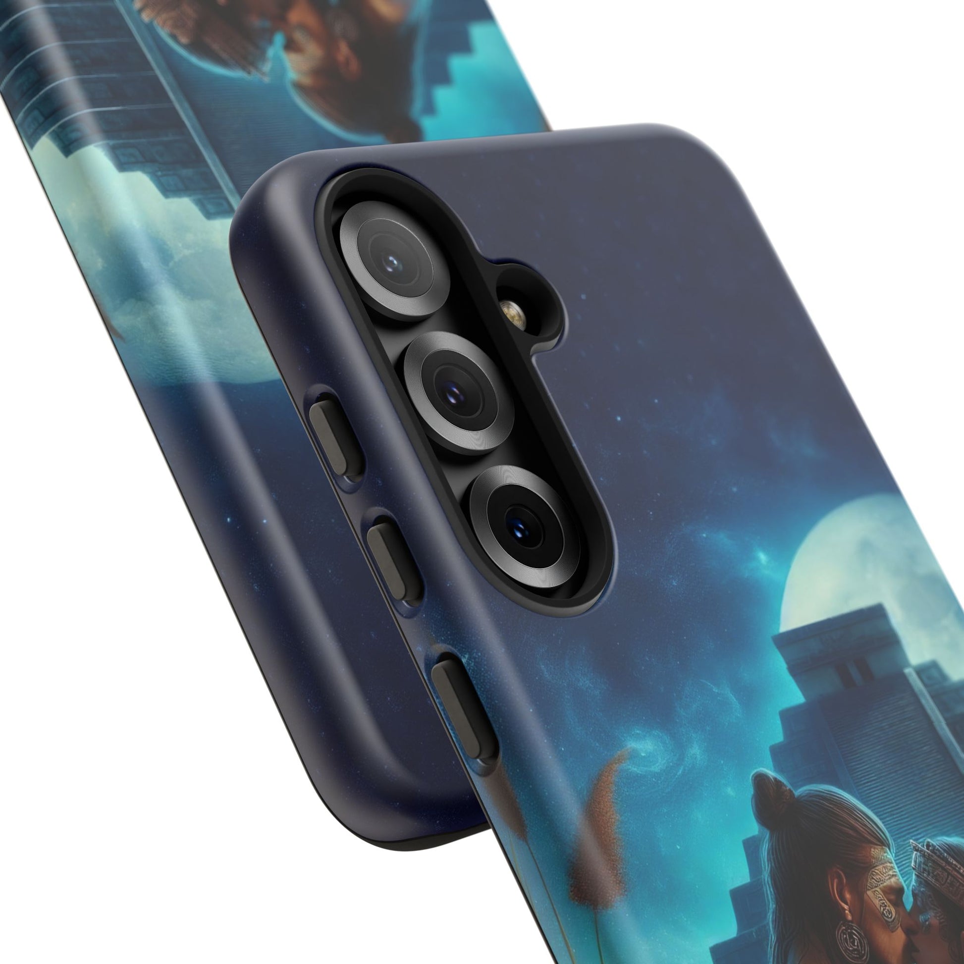 Aztec Affection showcases a romantic moment between an Aztec couple kissing in front of a pyramid at full moon. The warm colors and rich cultural backdrop make it a perfect design for tough cases, blending passion with heritage.