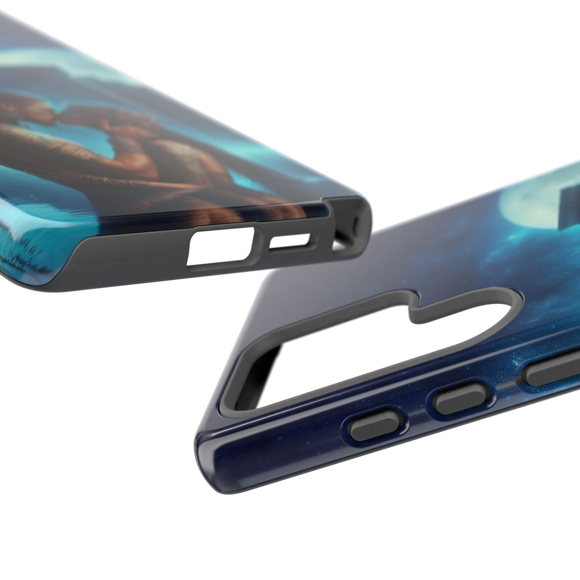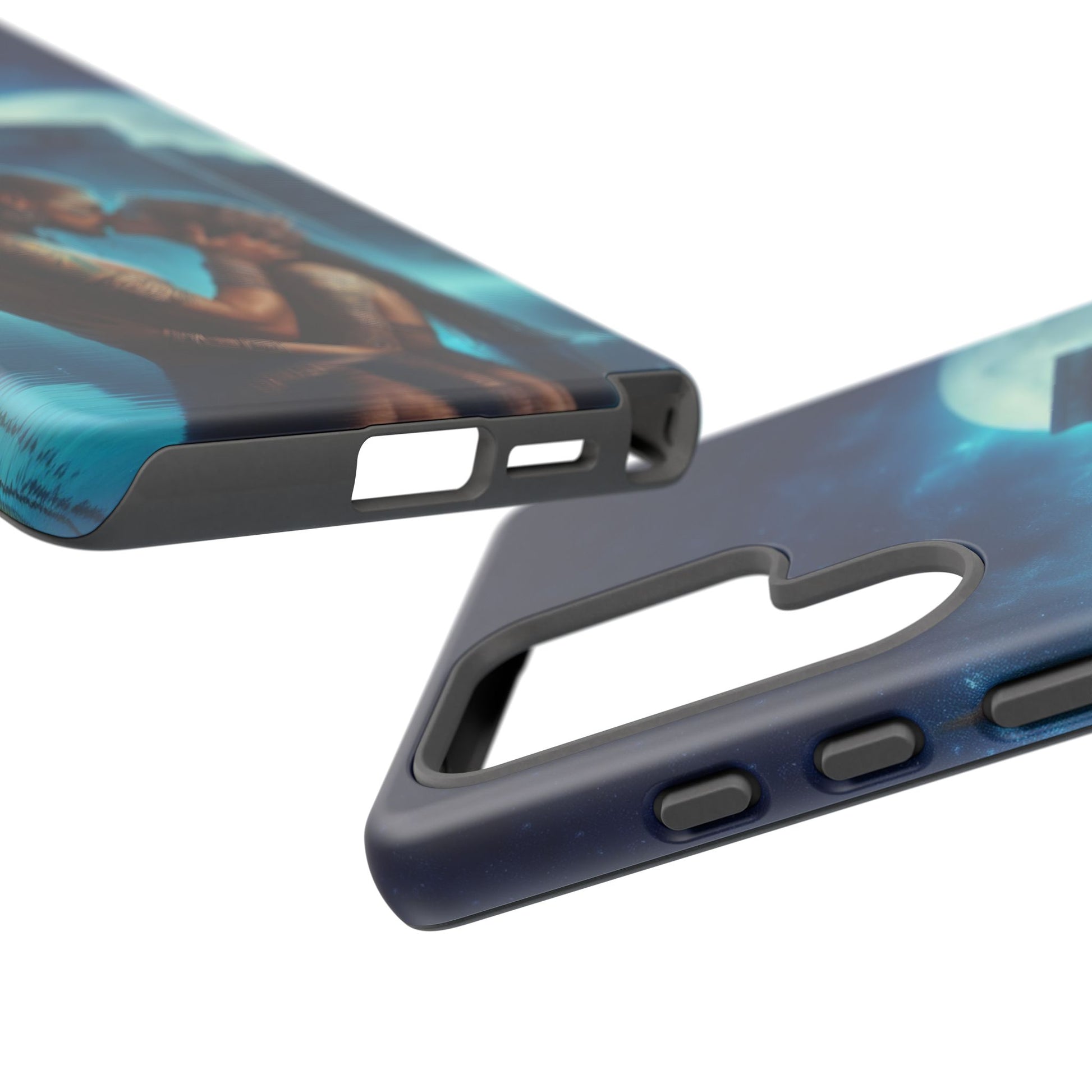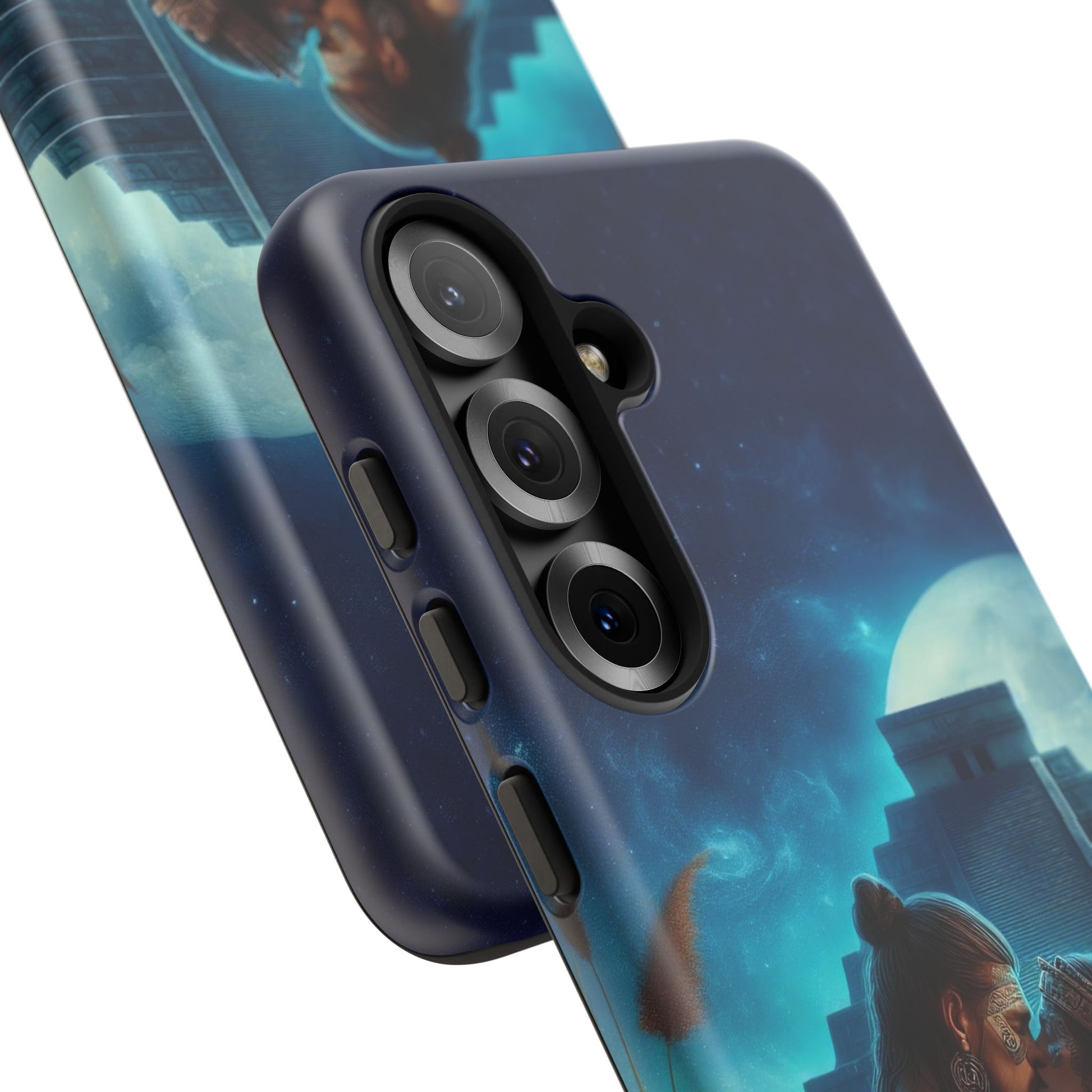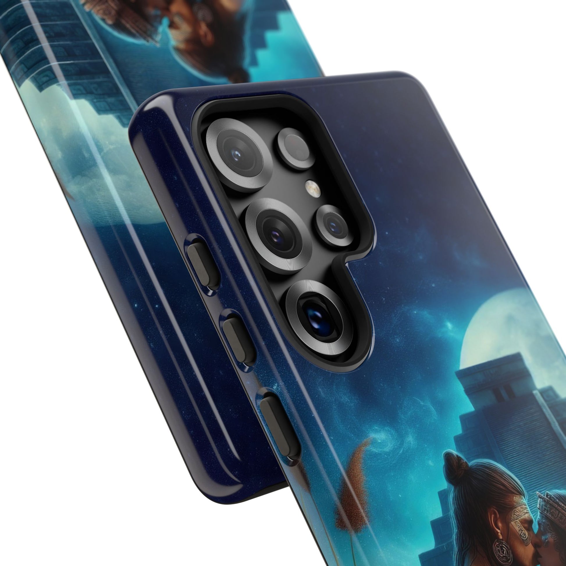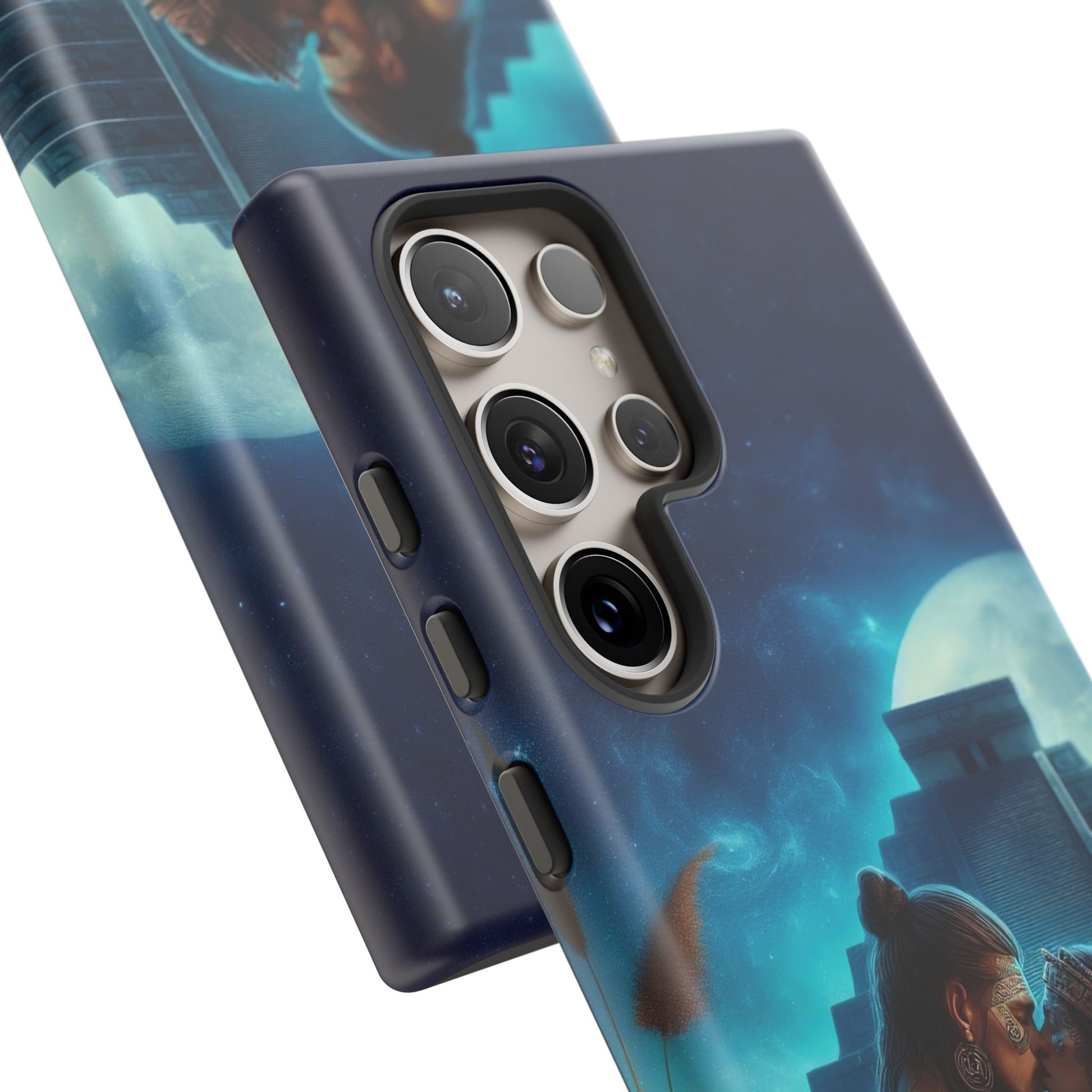 Aztec Affection showcases a romantic moment between an Aztec couple kissing in front of a pyramid at full moon. The warm colors and rich cultural backdrop make it a perfect design for tough cases, blending passion with heritage.
