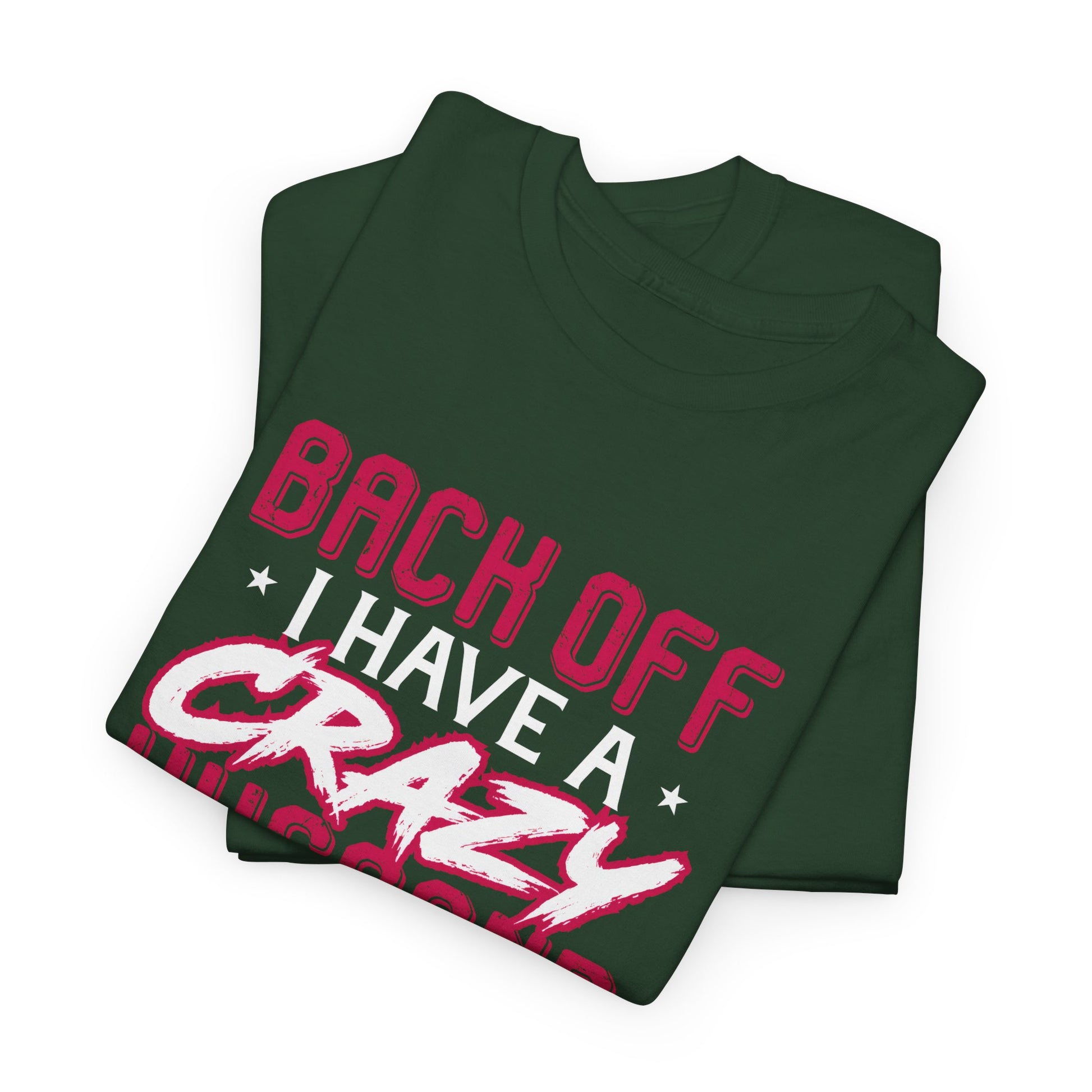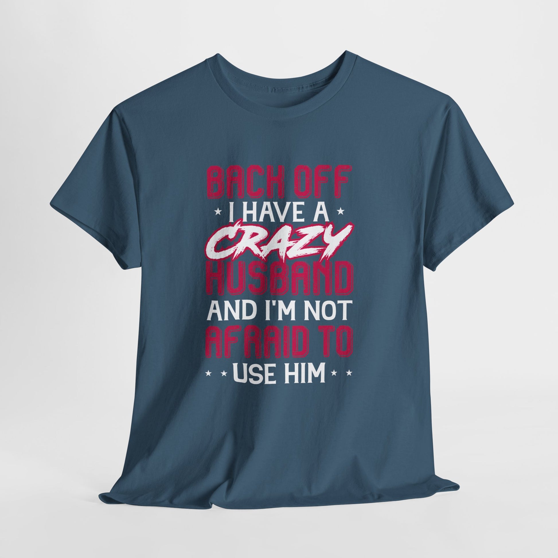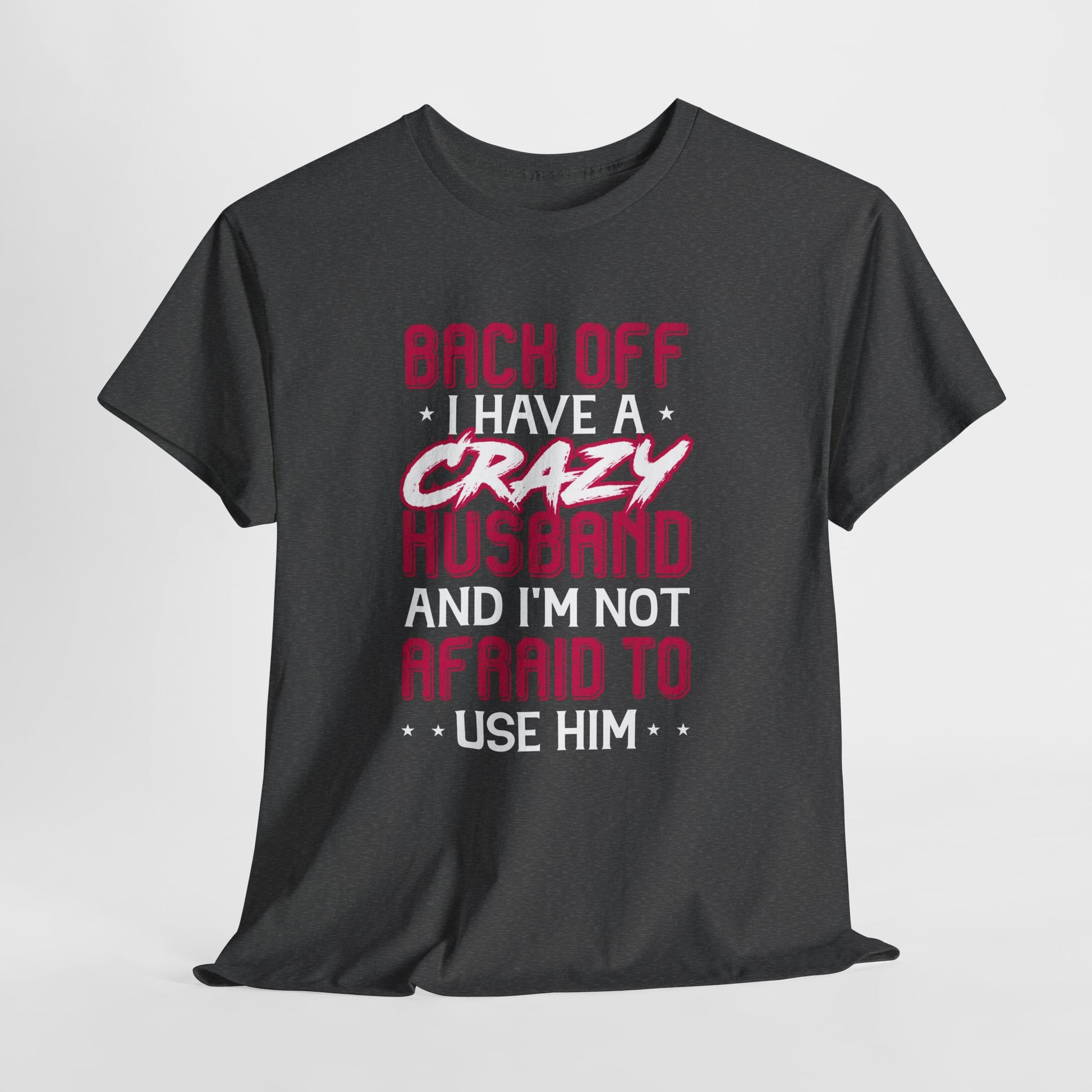 This humorous T-Shirt with the message 'Back Off, I Have a Crazy Husband' is perfect for anyone looking to make a statement. It gives off a playful and fun vibe, making it a great conversation starter. Ideal for wives with a sense of humor or as a gift for someone with a quirky spouse. Perfect for birthdays, anniversaries, or just to show off some personality.
