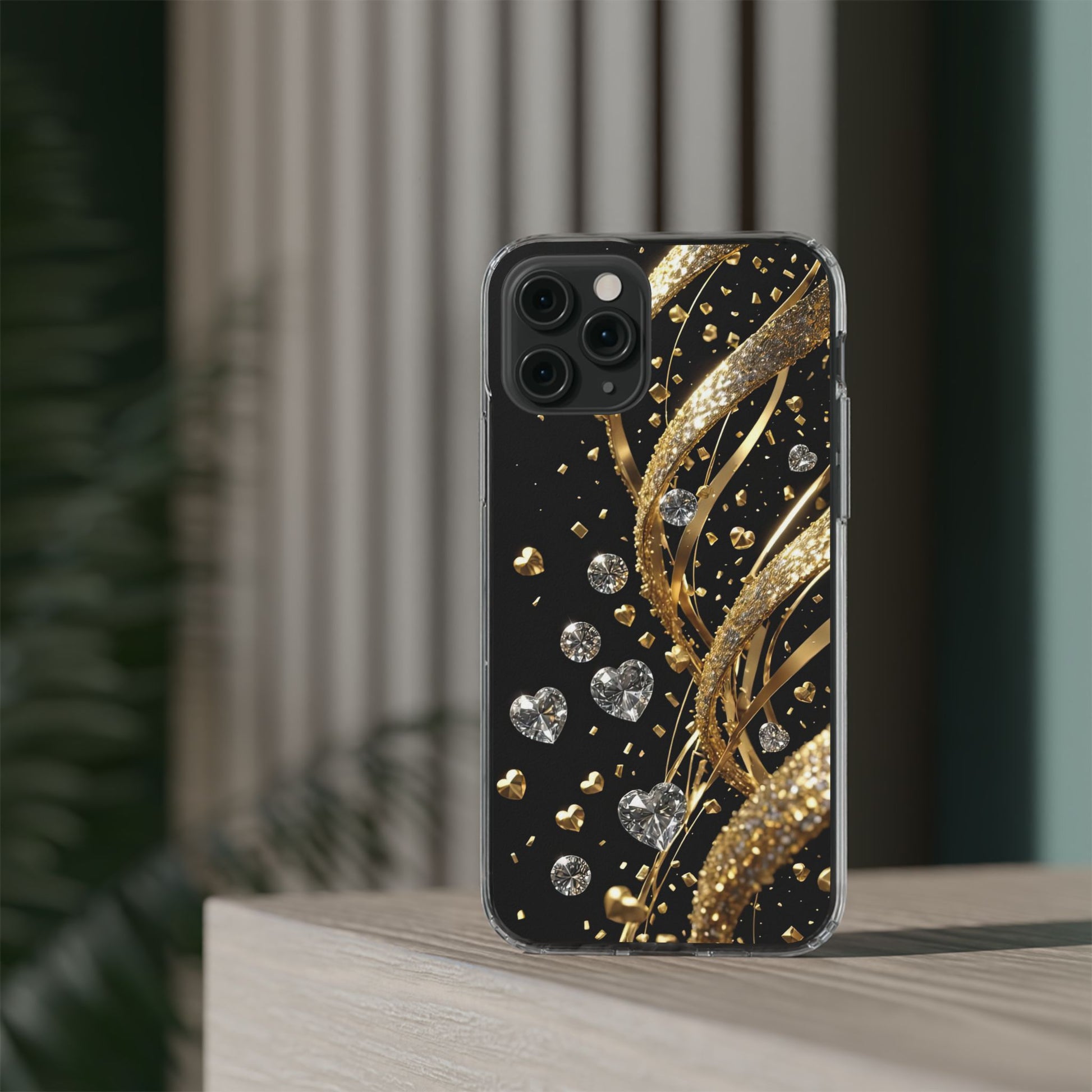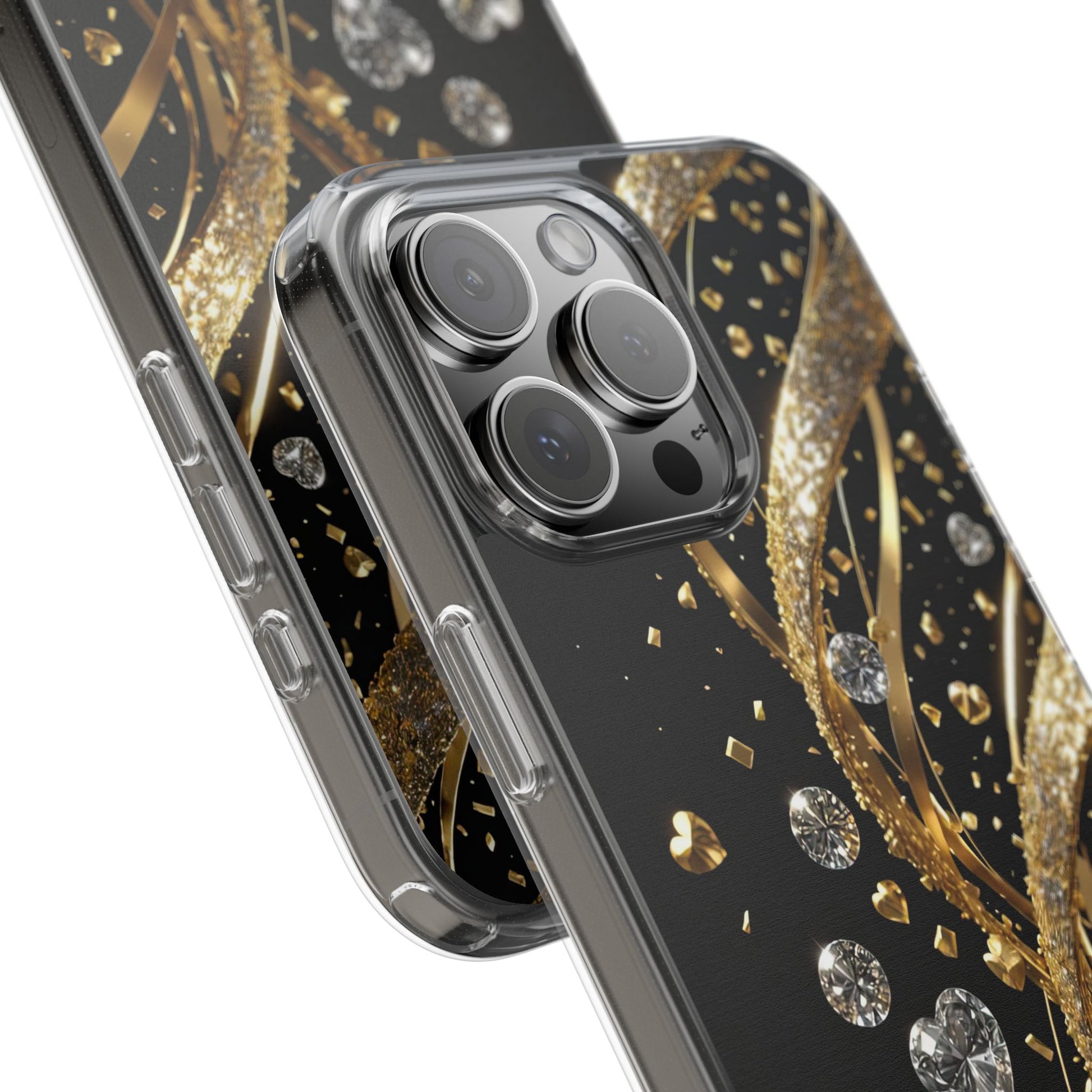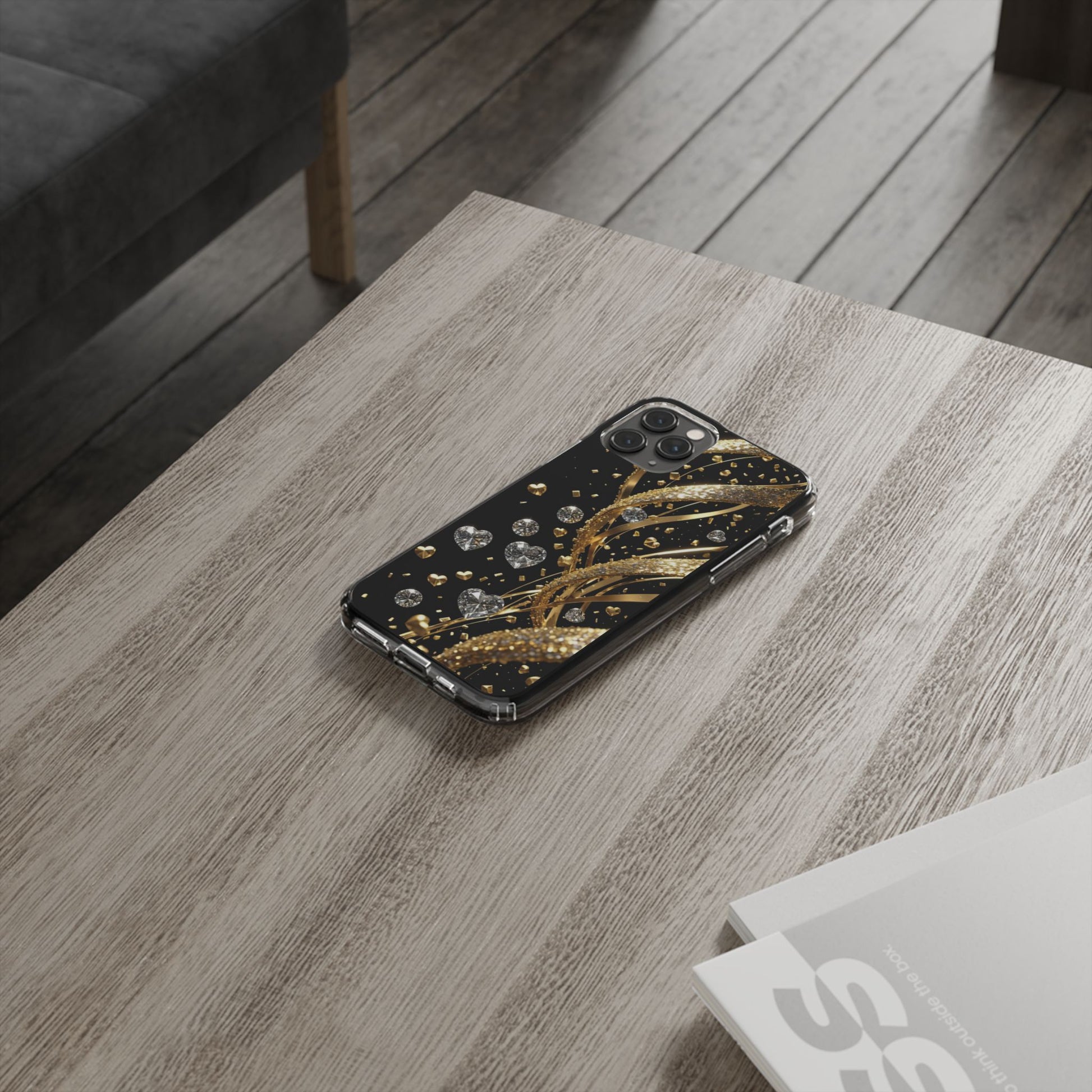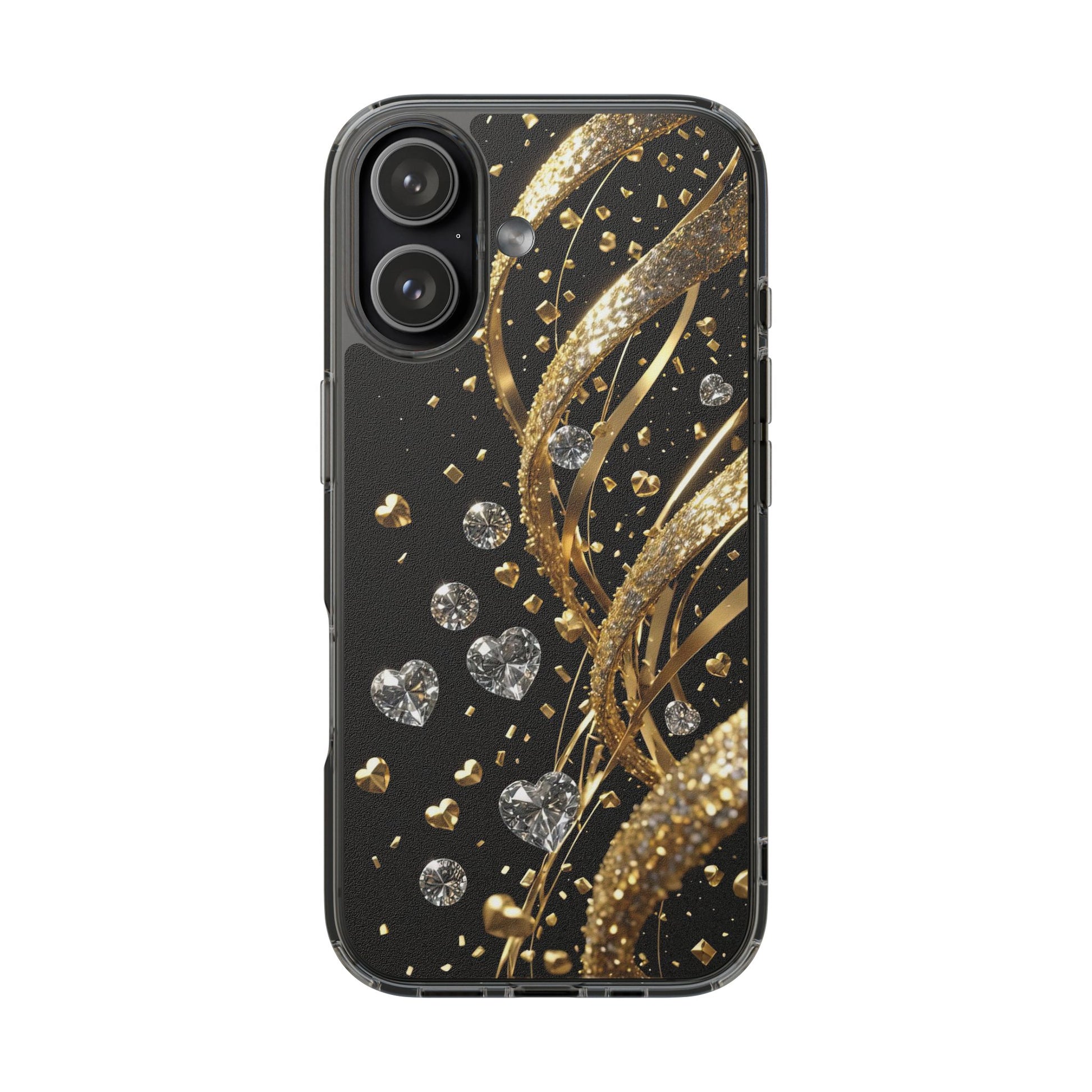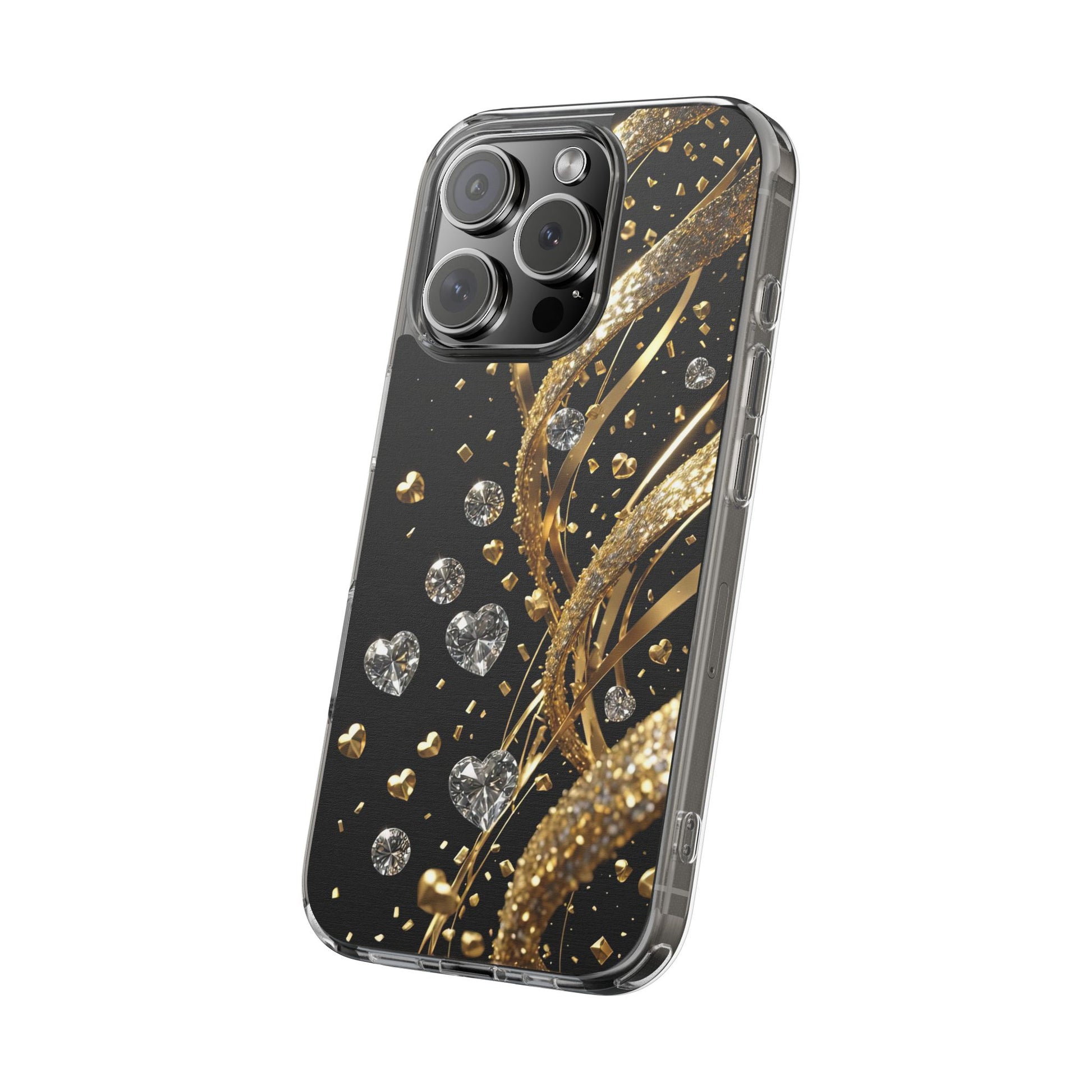 Gleaming Heart Clear Case, Elegant Gold Glitter, Sparkling Design