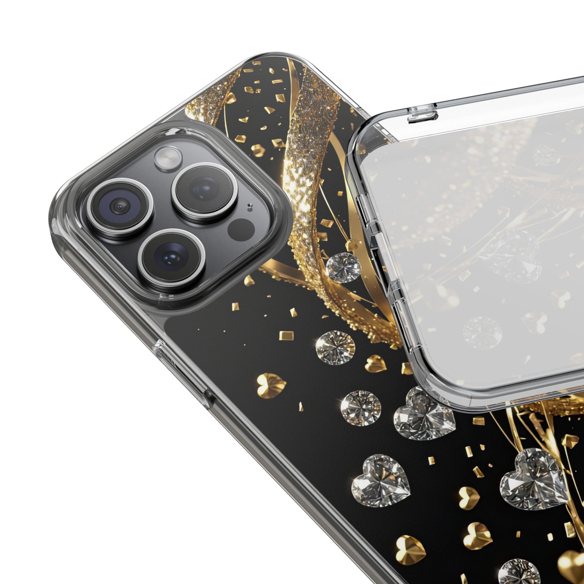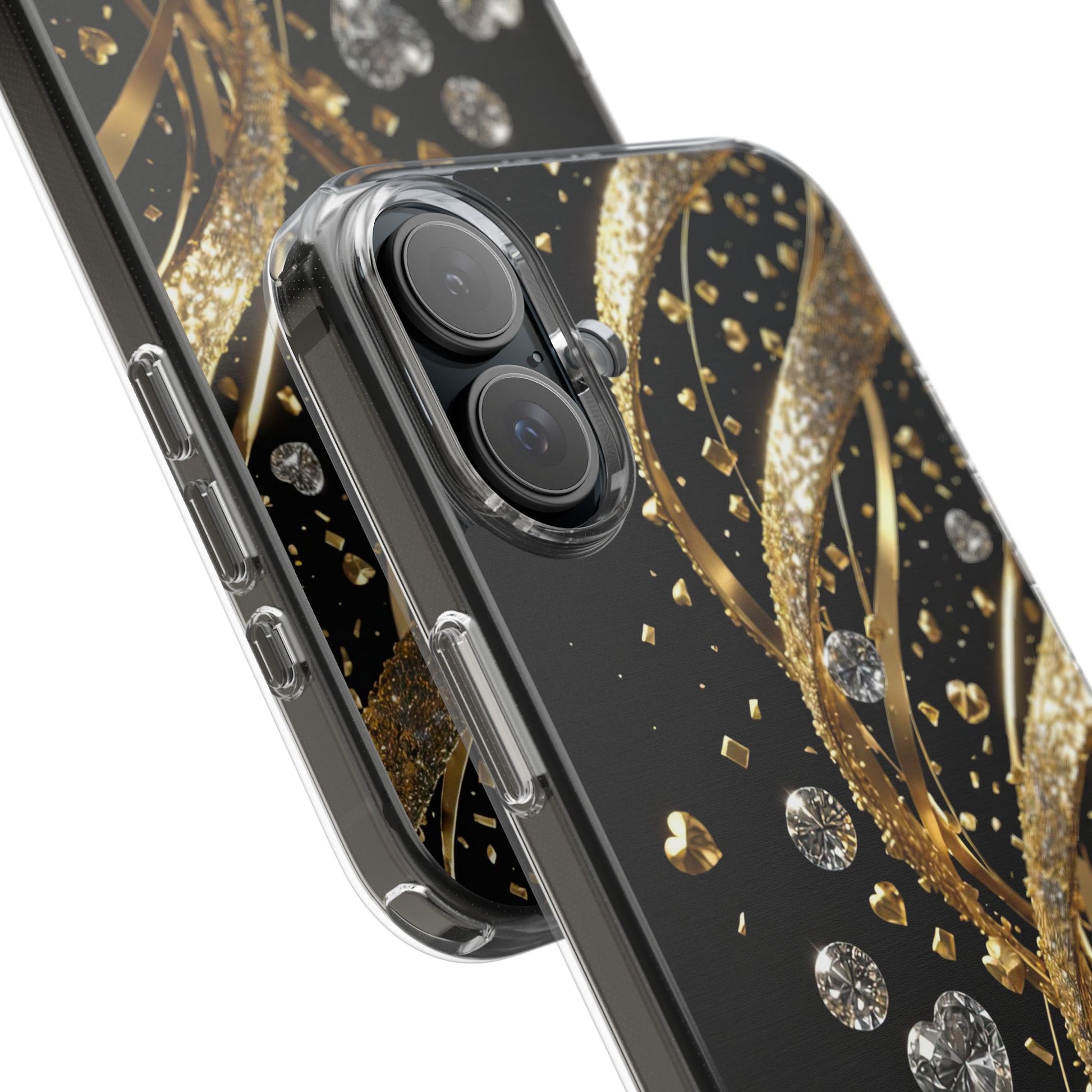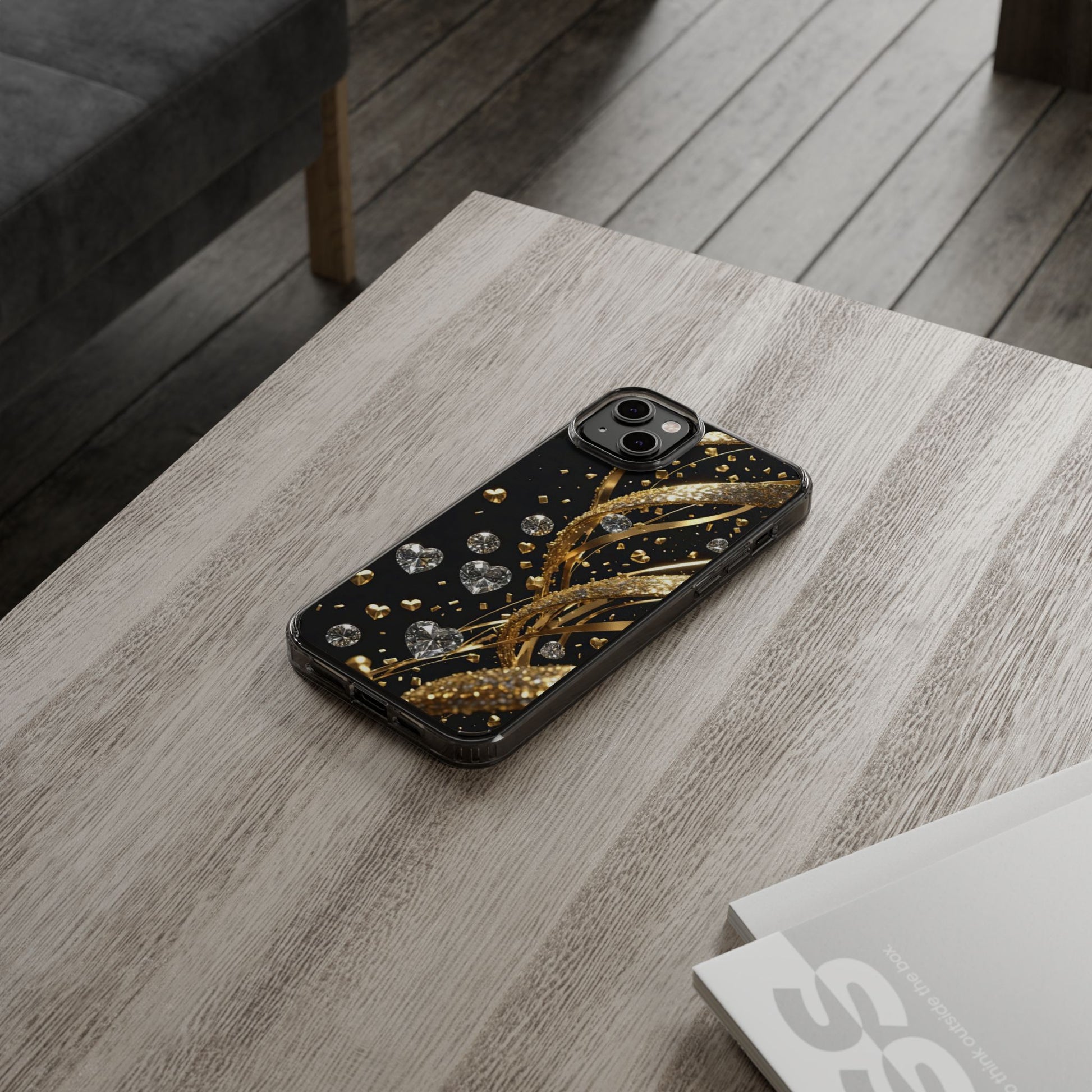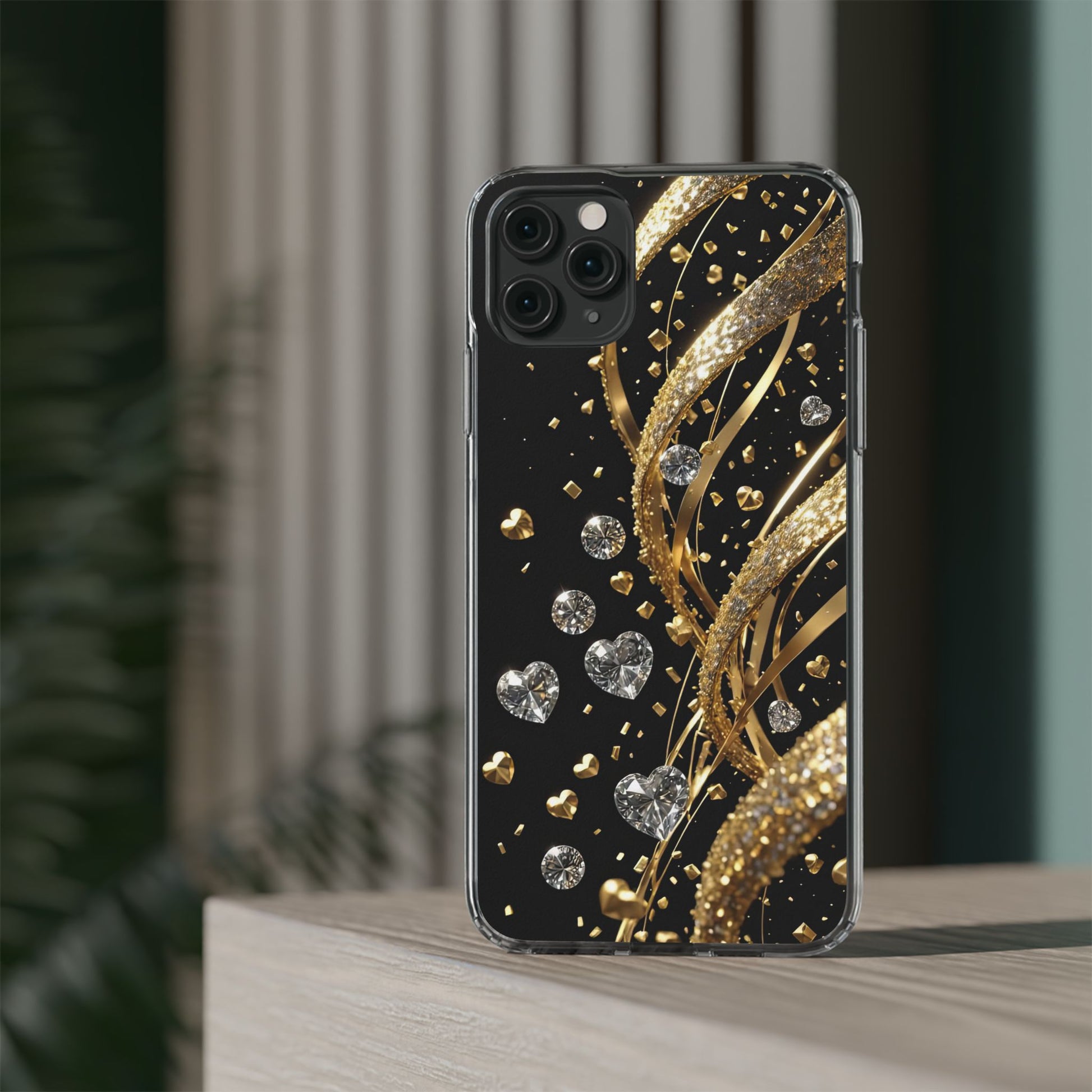 Gleaming Heart Clear Case, Elegant Gold Glitter, Sparkling Design