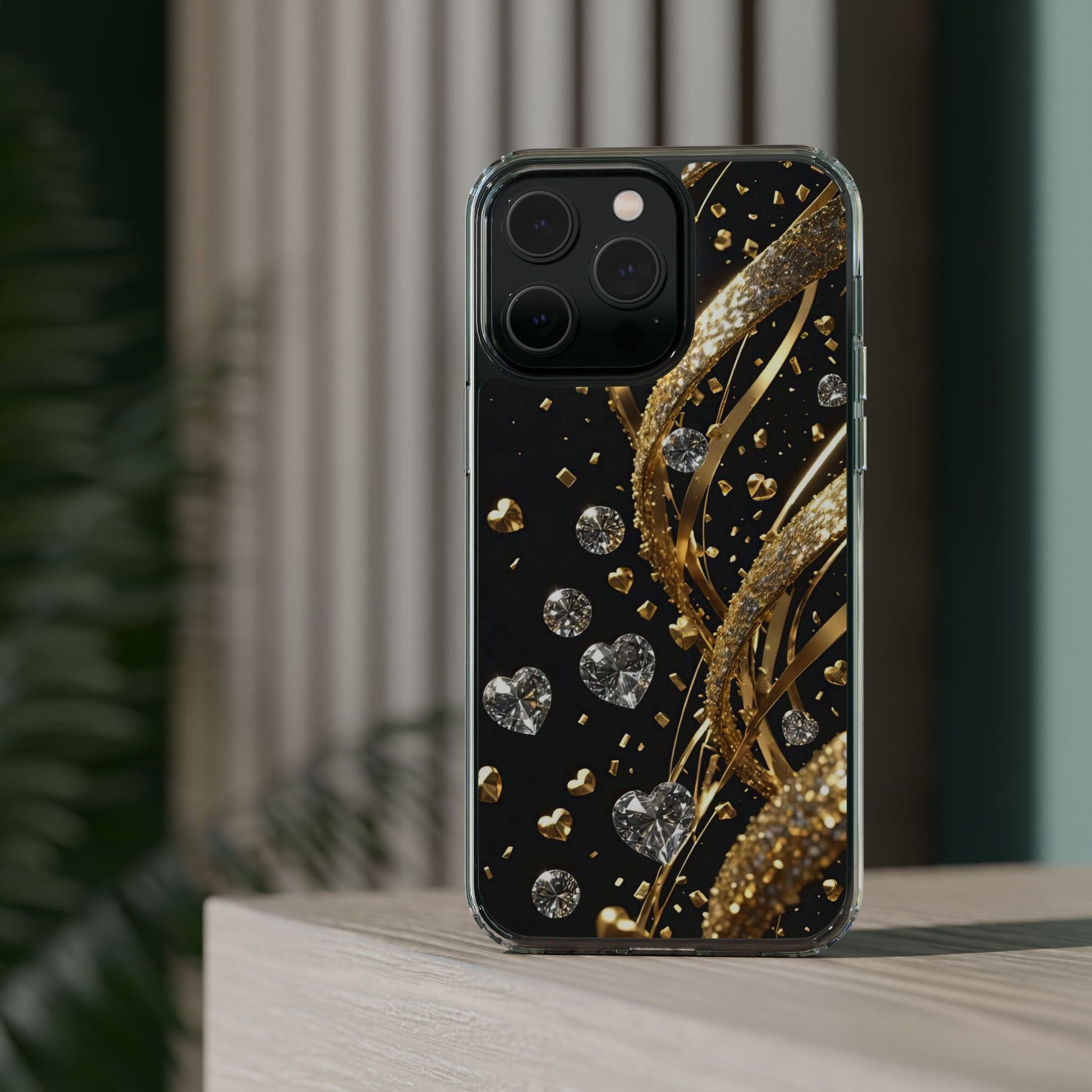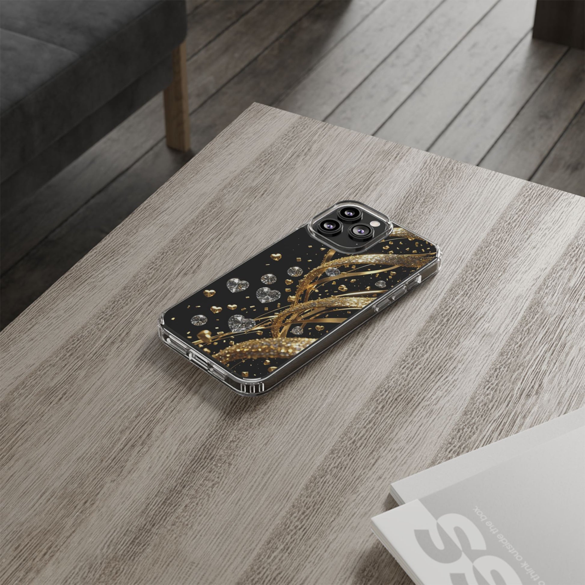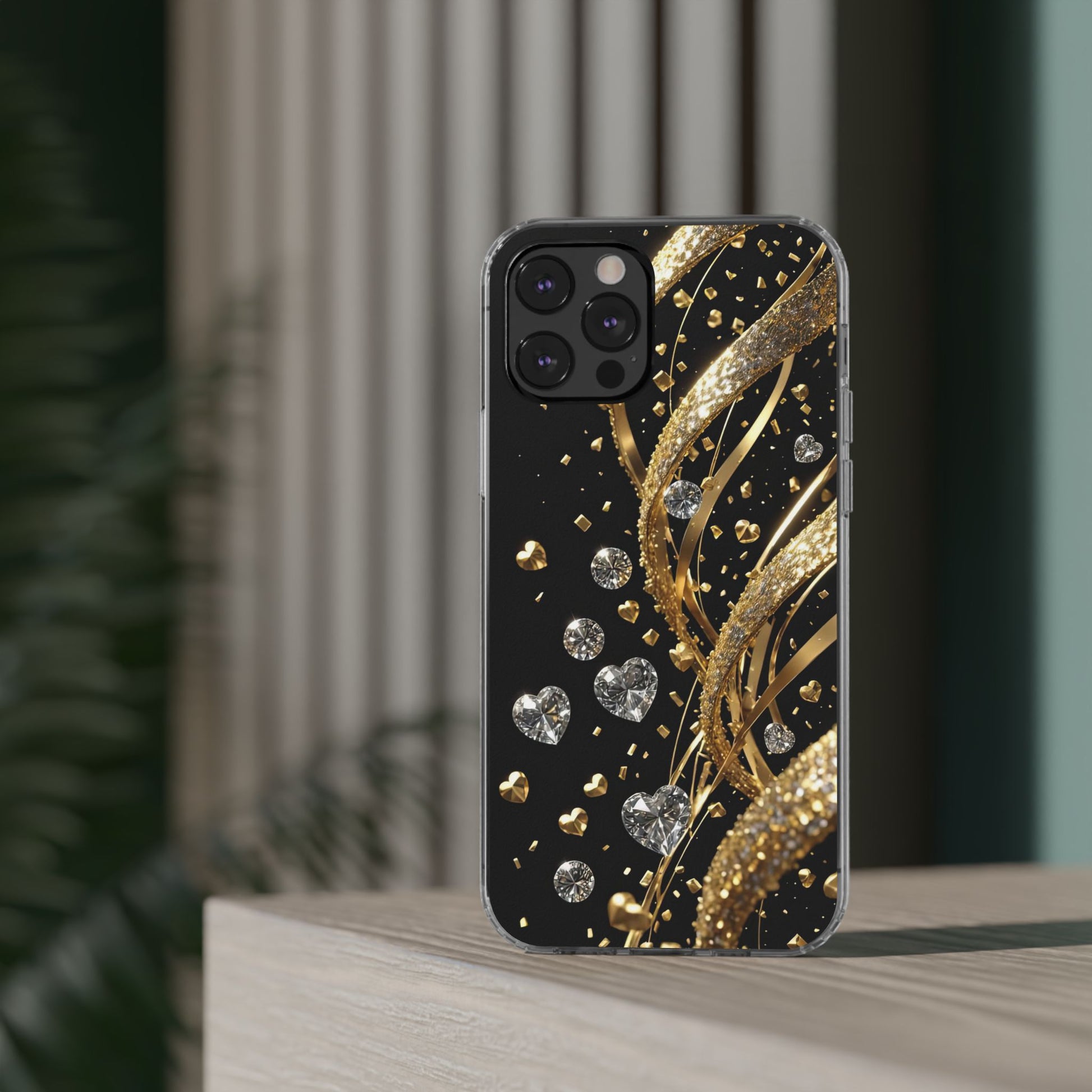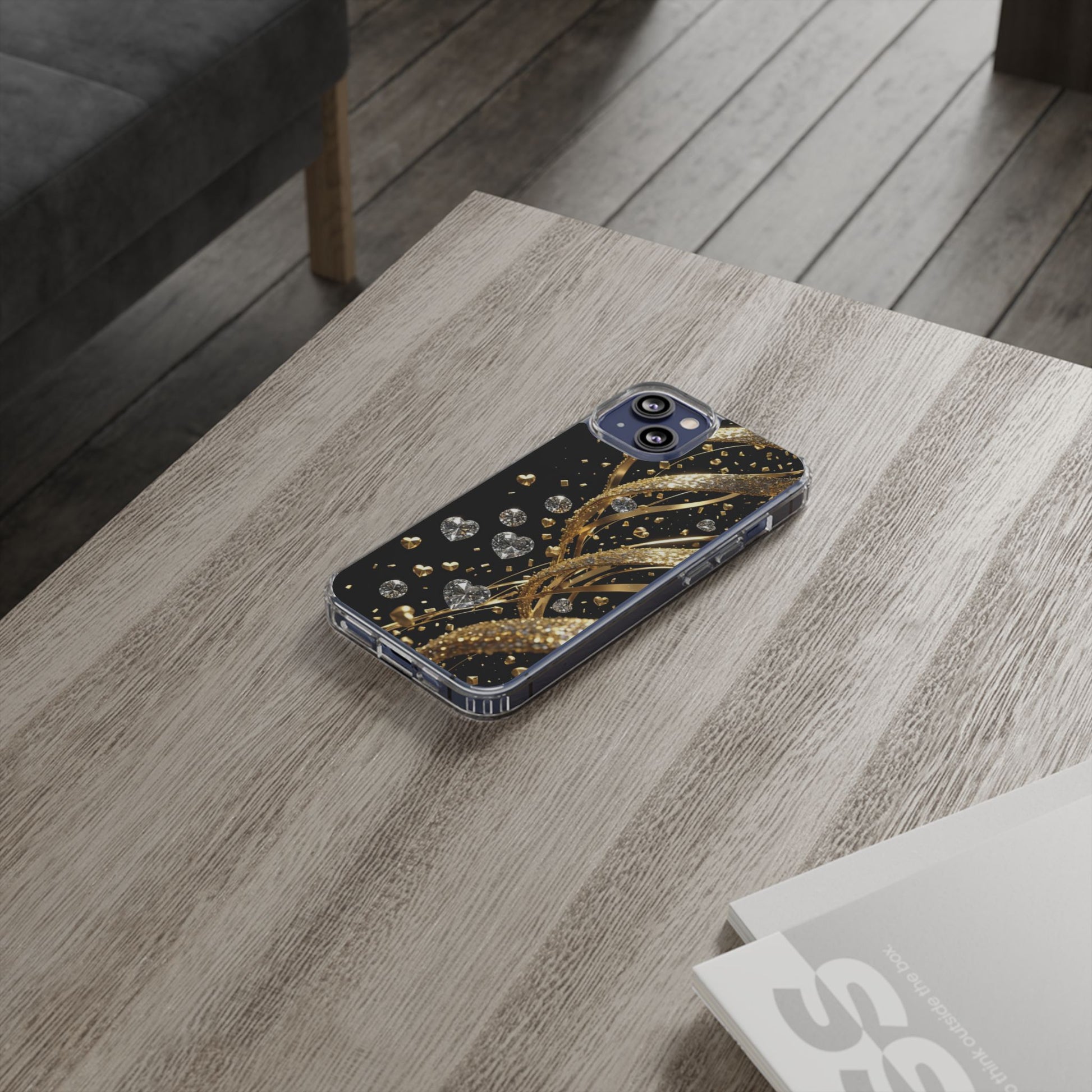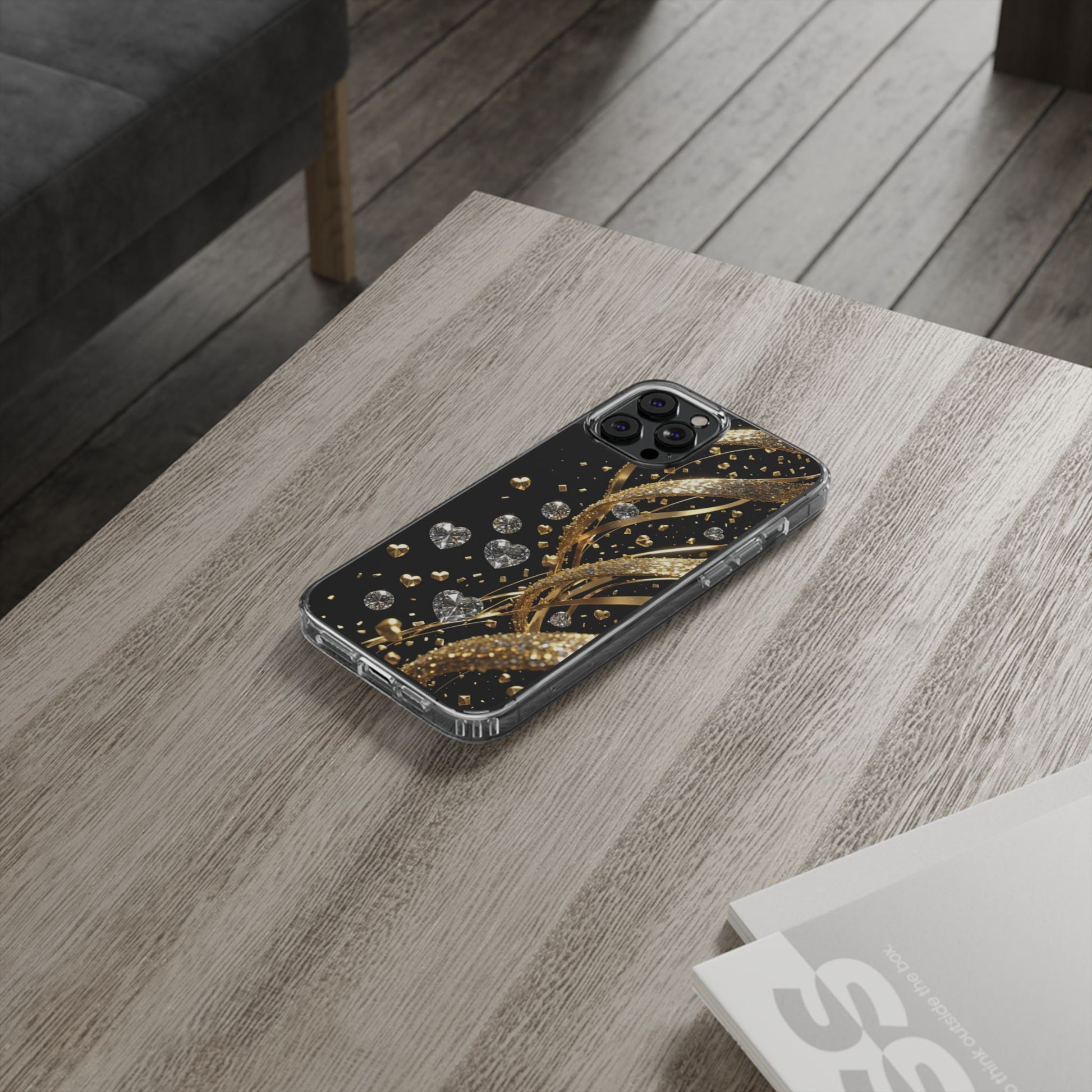 Gleaming Heart Clear Case, Elegant Gold Glitter, Sparkling Design