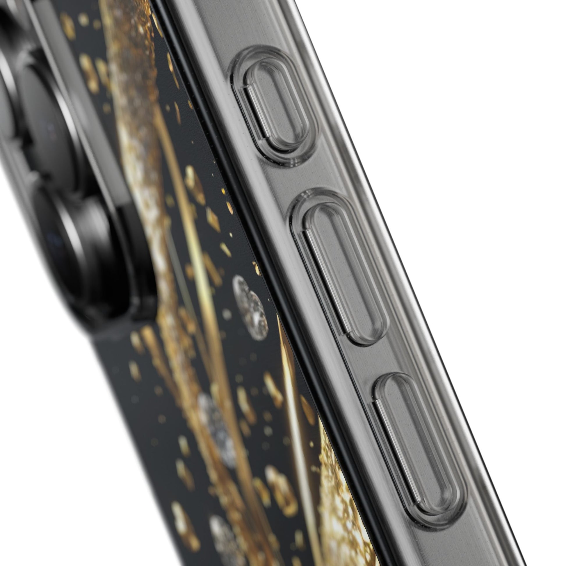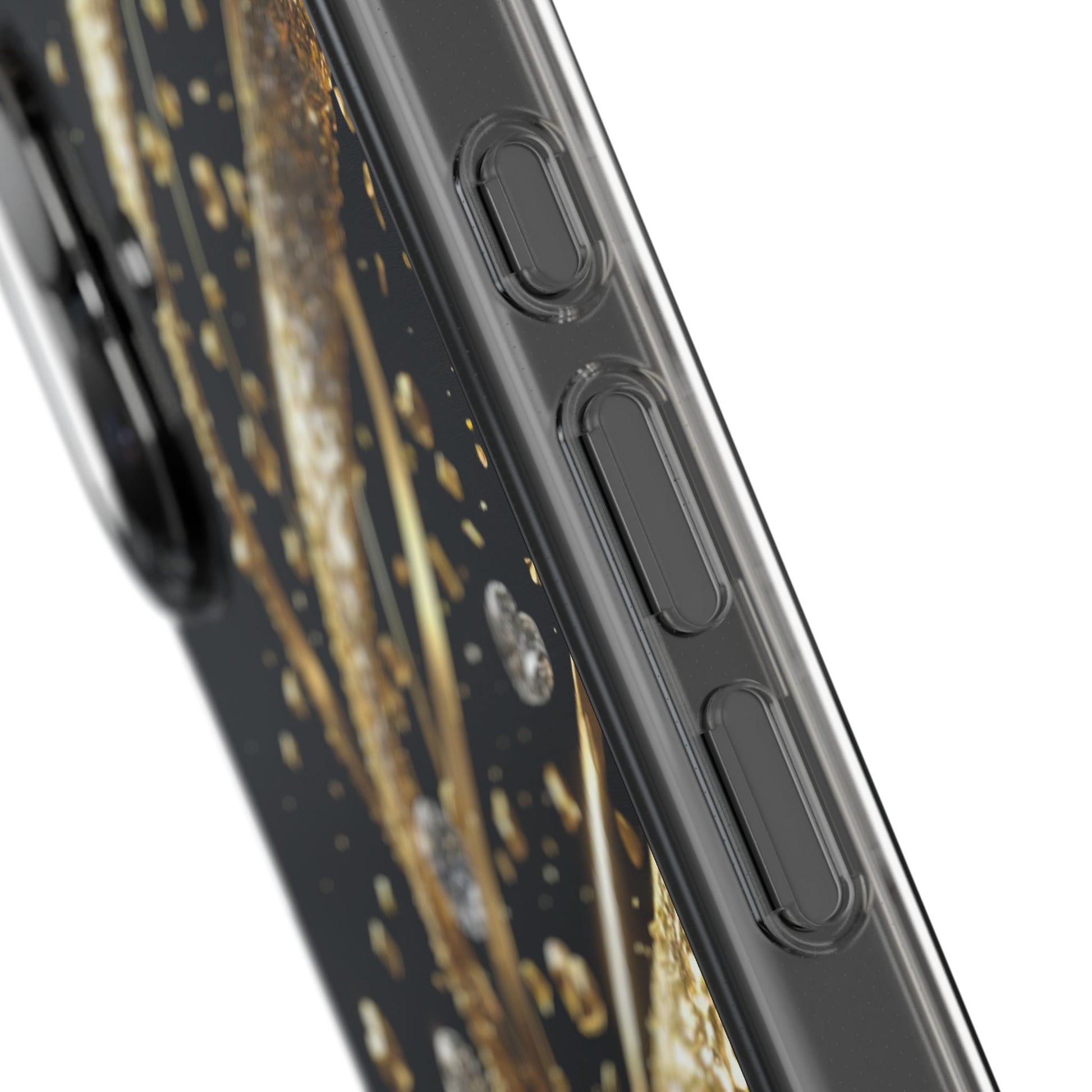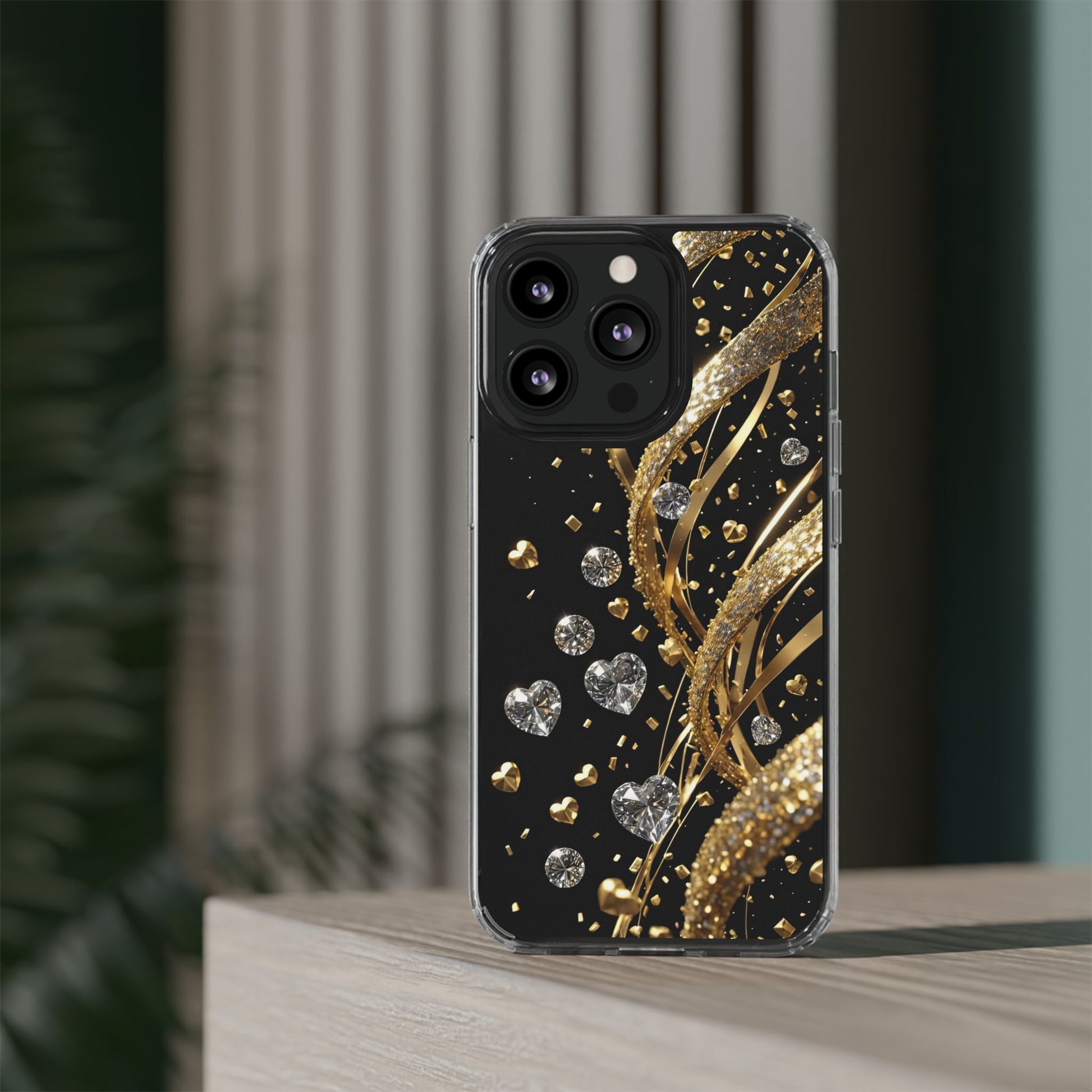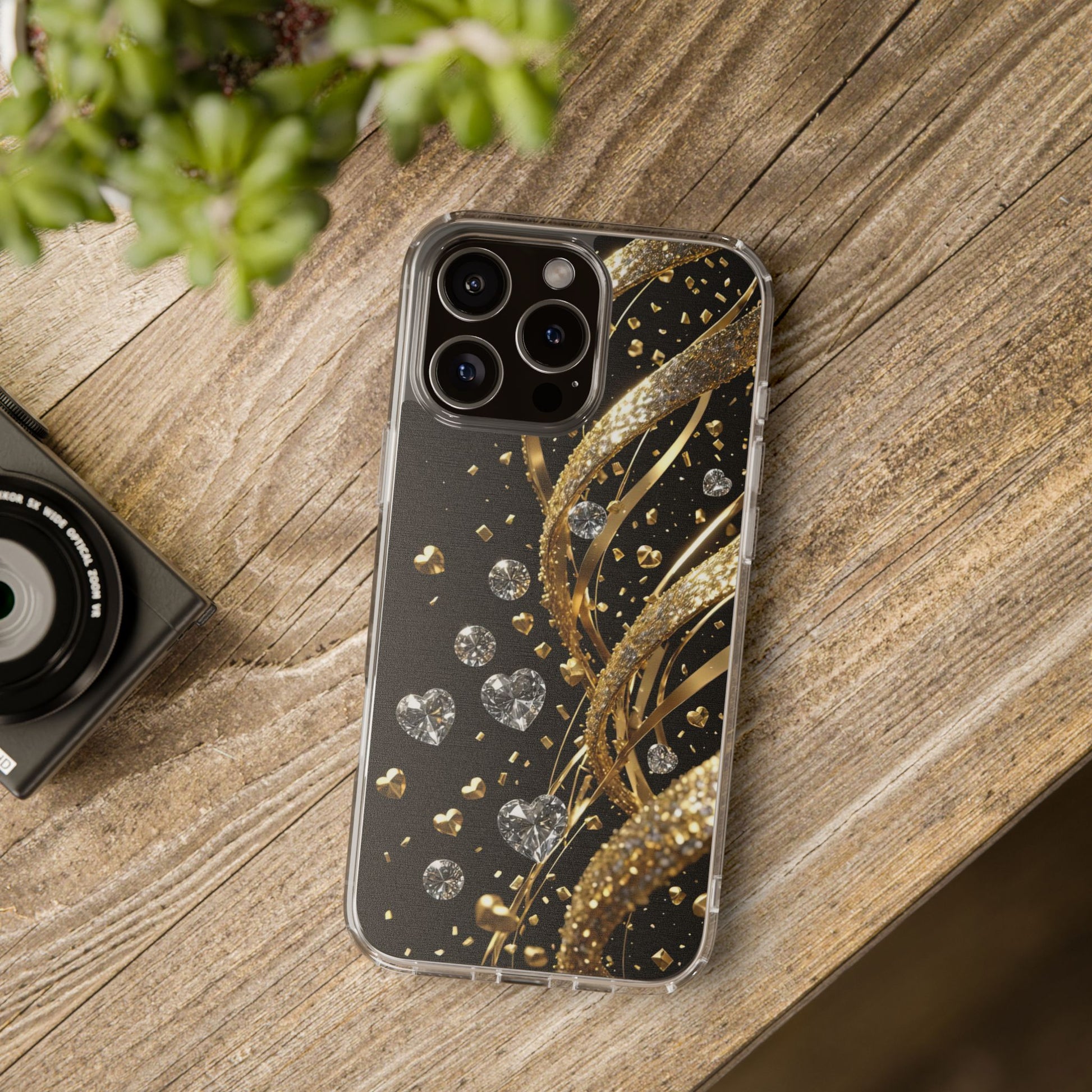 Gleaming Heart Clear Case, Elegant Gold Glitter, Sparkling Design