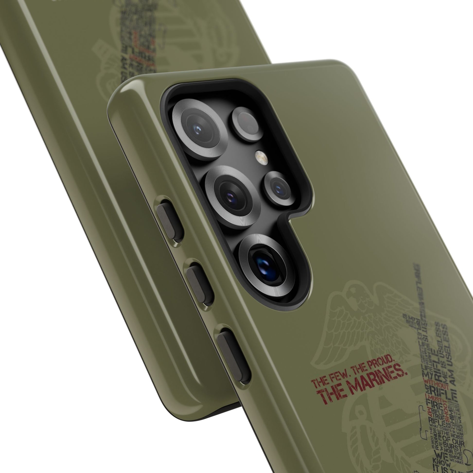 A marine corps design phone case with a glossy or matte surface, durable polycarbonate plastic construction, vibrant colors, and full-wrap print. This impact-resistant case is flexible, durable, and supports wireless charging. Perfect for those who love military themes and want to protect their phone with style.