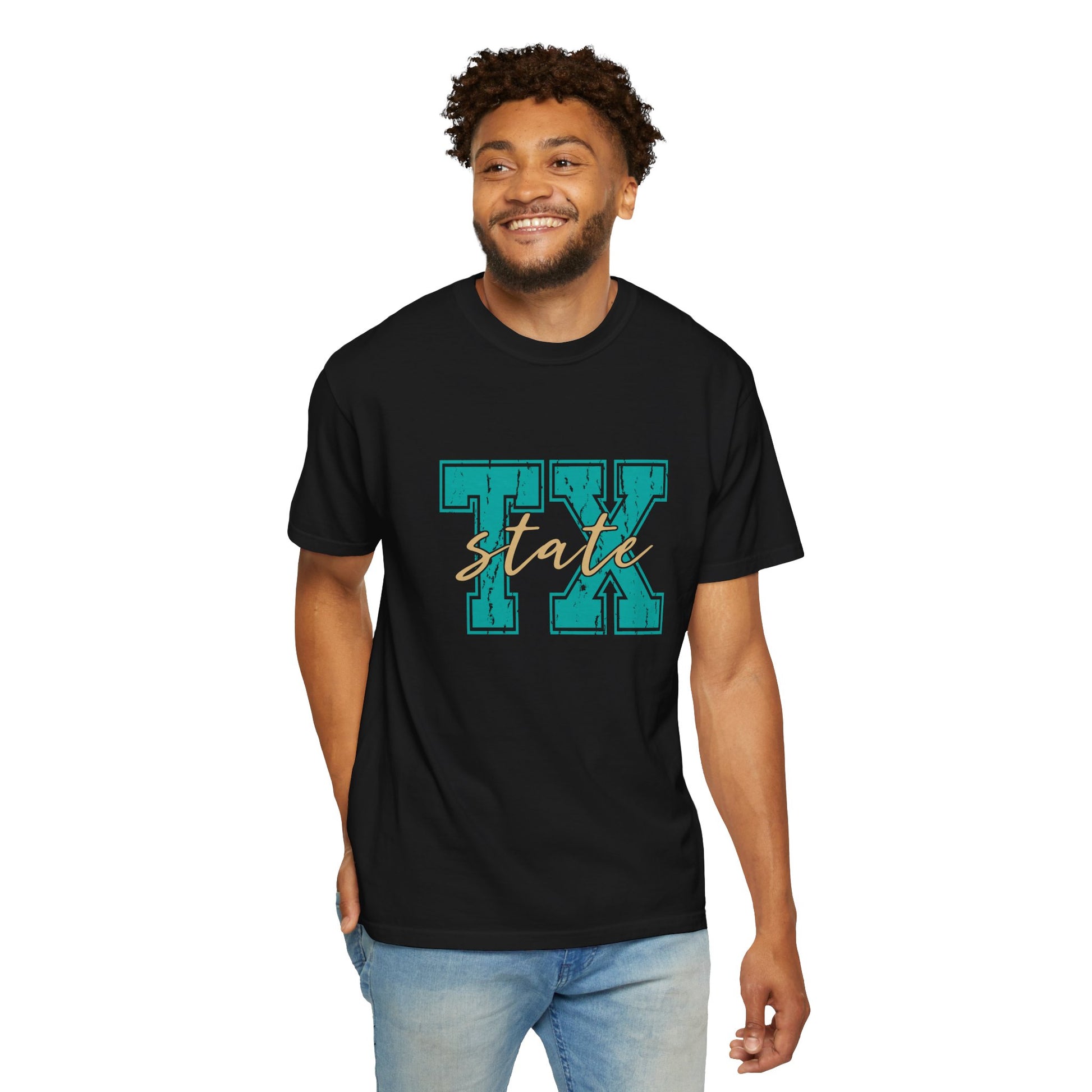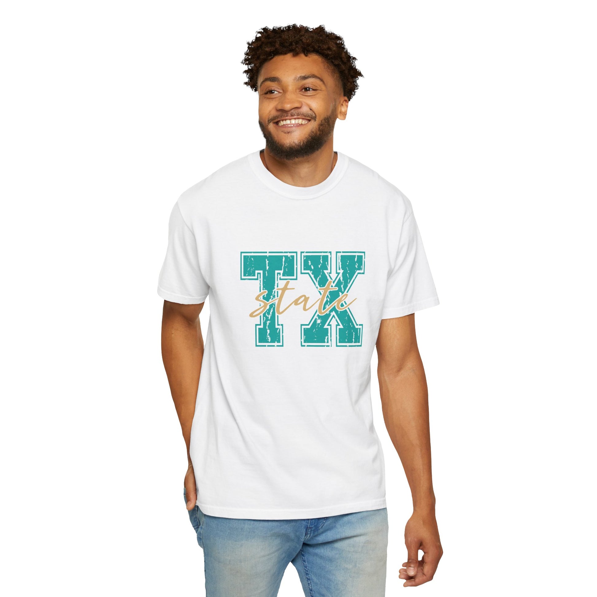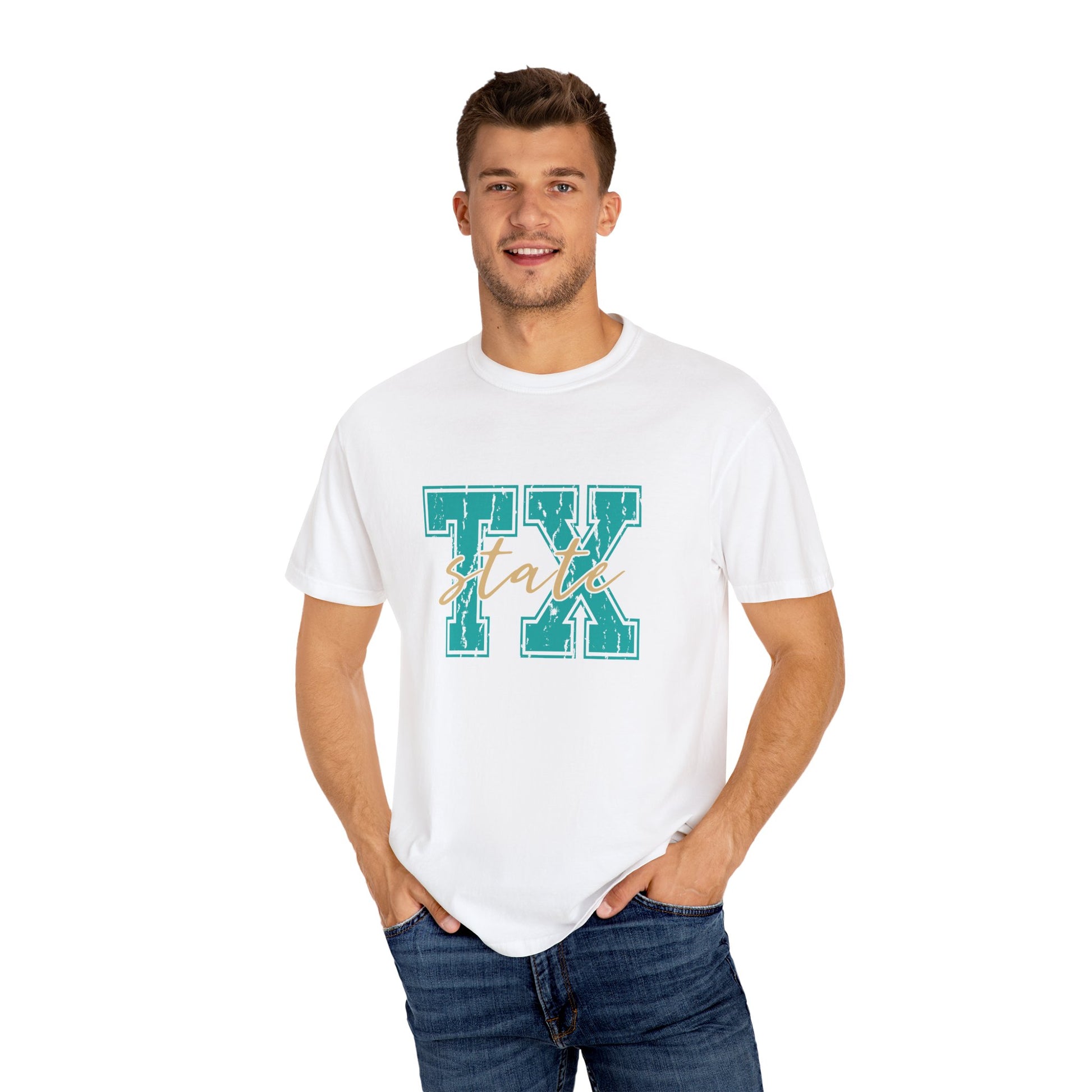 The "TX State" Unisex Garment-Dyed T-shirt is a stylish tribute to Texas pride. Made from soft, high-quality cotton, this pre-washed tee offers a relaxed, vintage-inspired fit with rich, long-lasting colors. The unique garment-dyed process gives it a distinct, worn-in look, while its comfortable construction makes it perfect for everyday wear. Show off your love for the Lone Star State in comfort and style with this effortlessly cool tee.