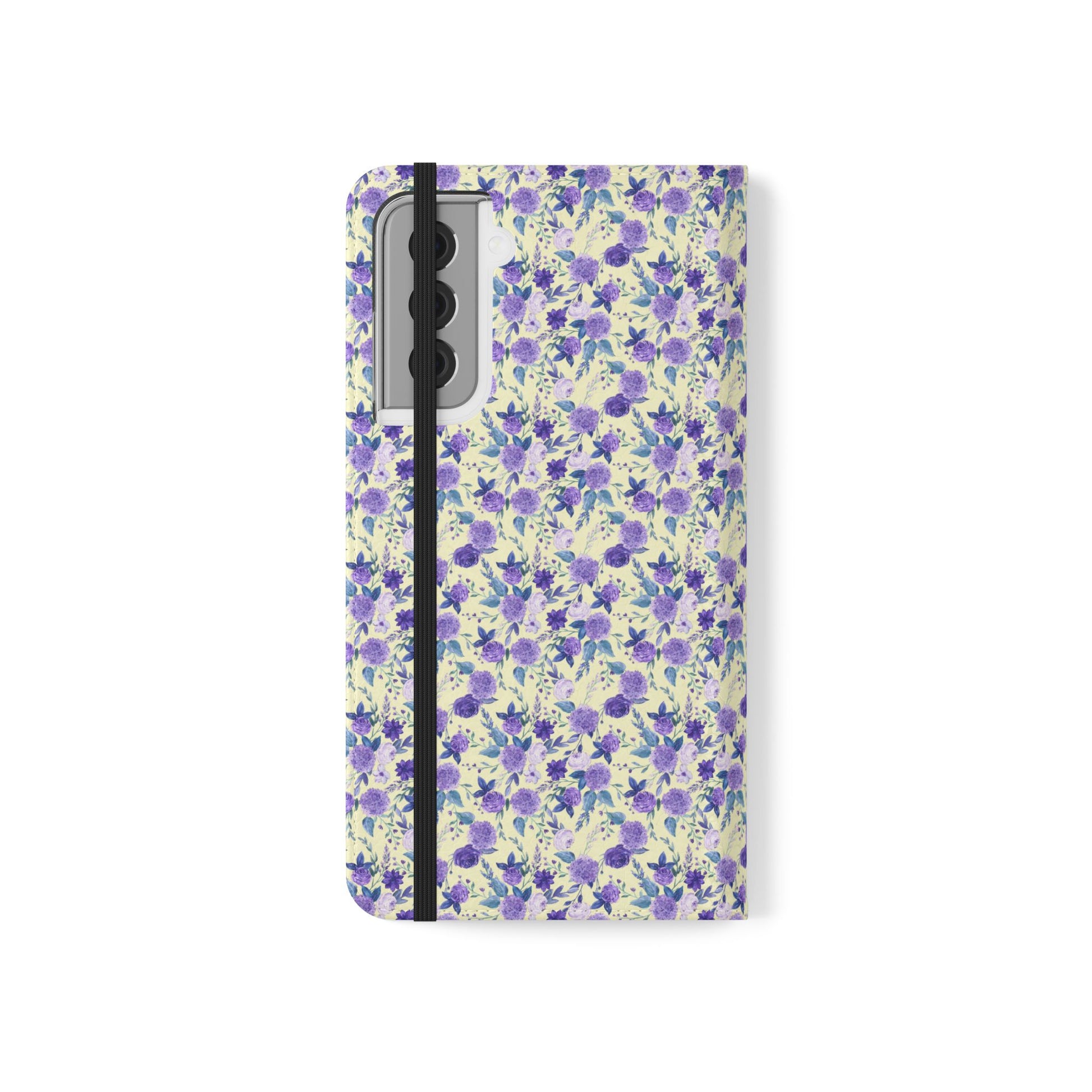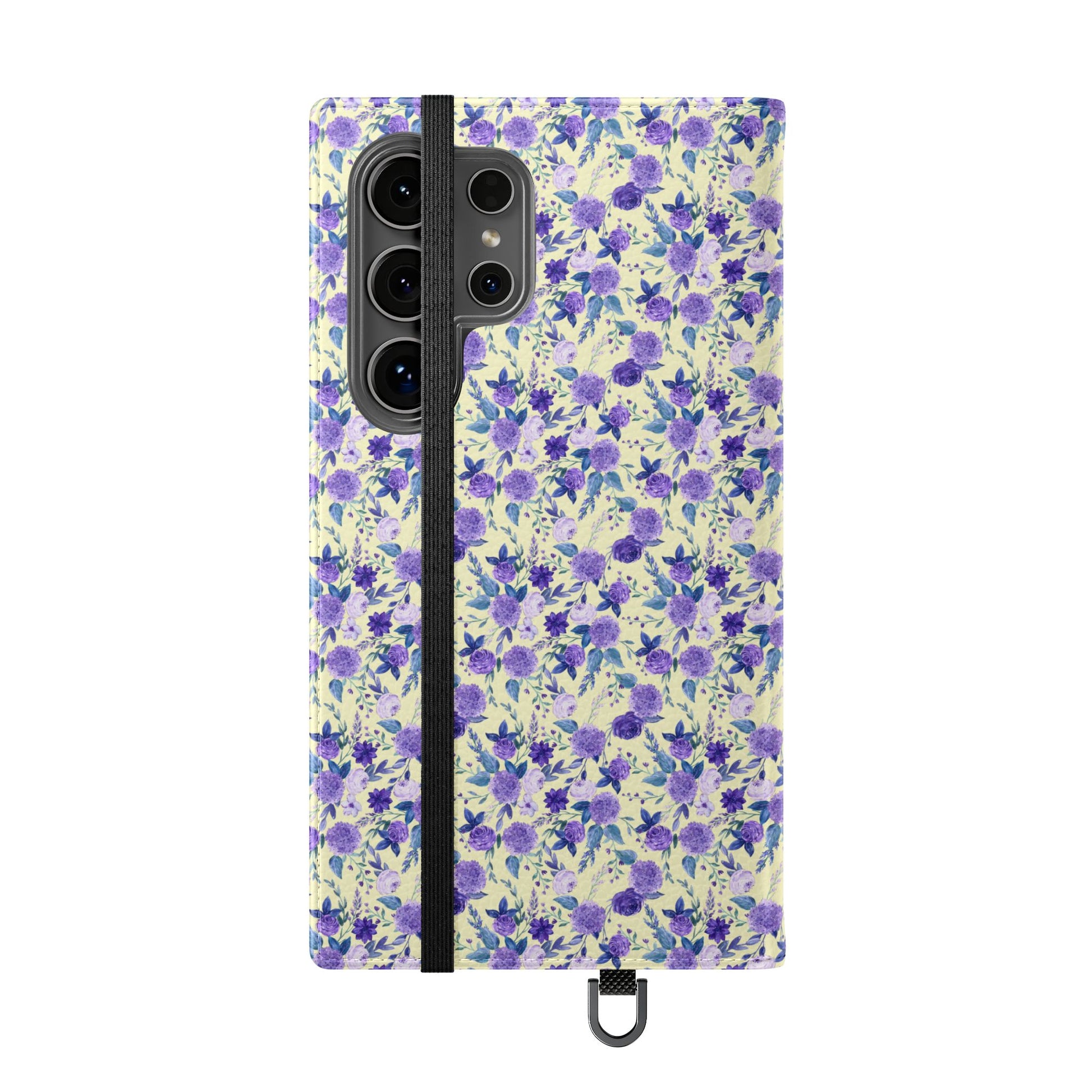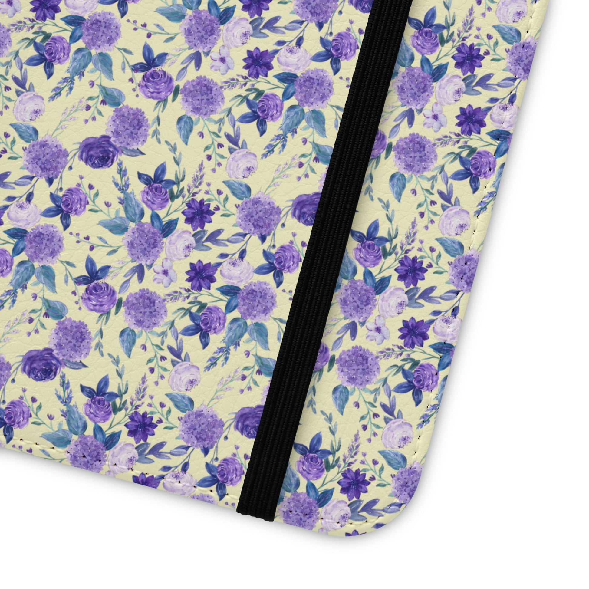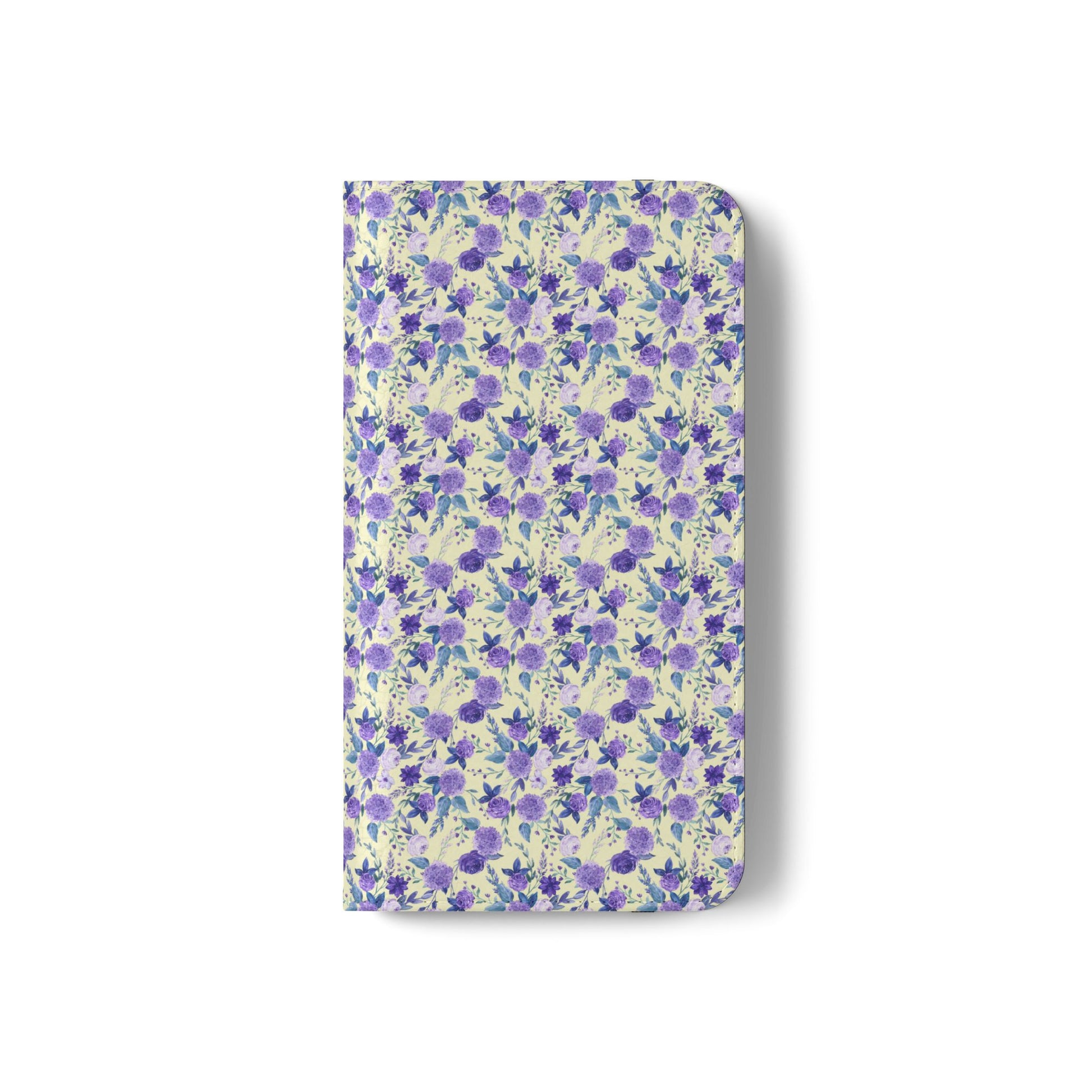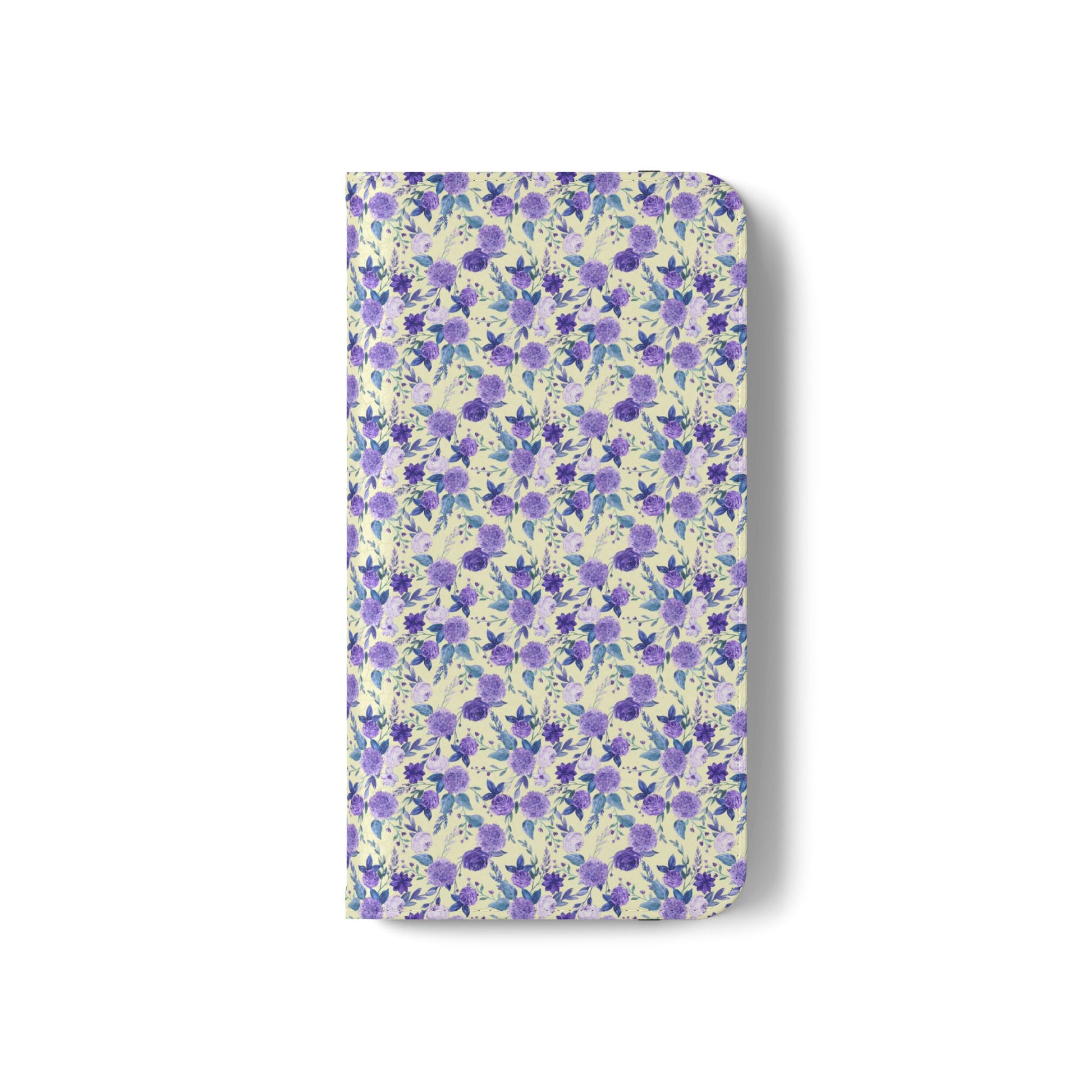 Violet phone cases with convenient compartments for cards and cash. Made from cruelty-free faux leather, perfect for adults. Features a D-ring for straps and stand for media viewing. Ideal for Samsung Galaxy models.