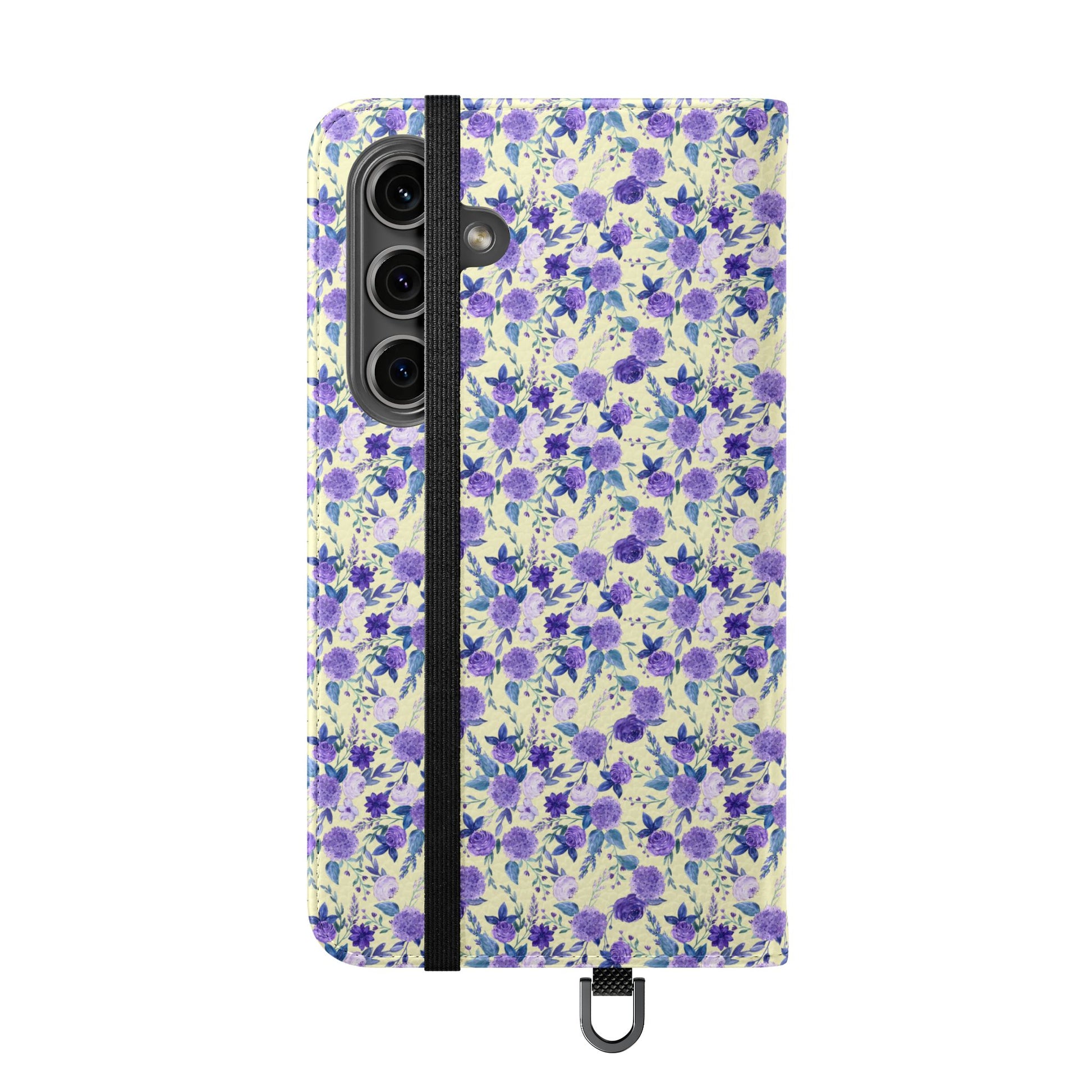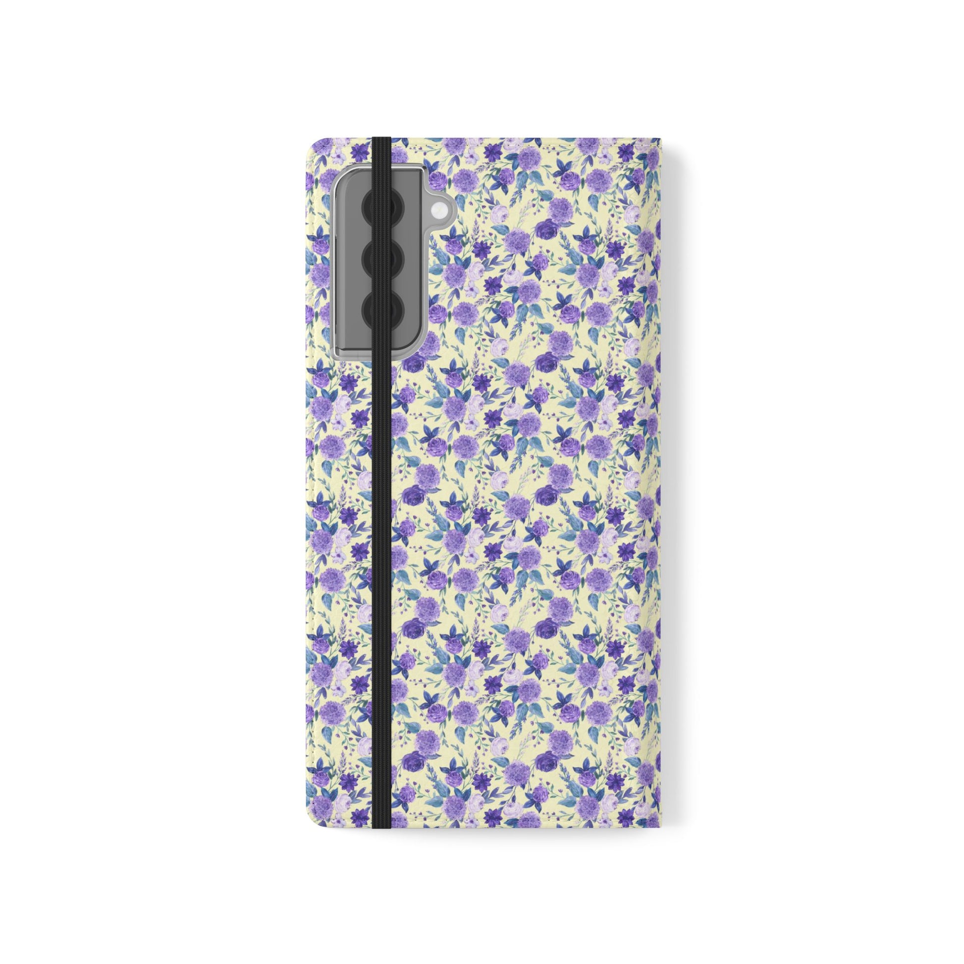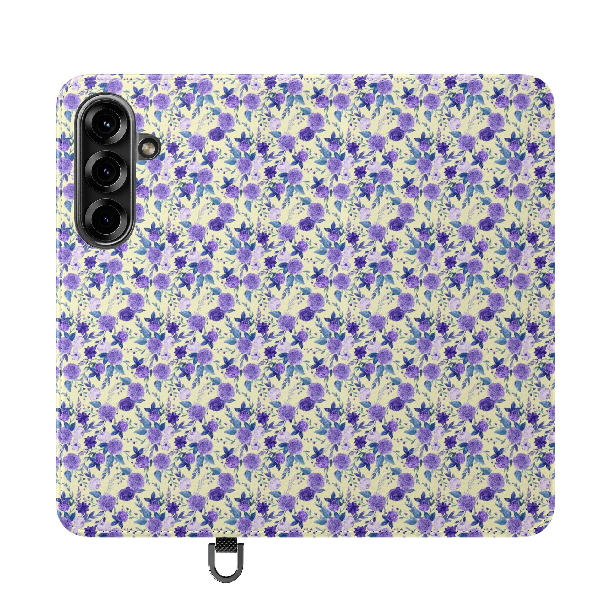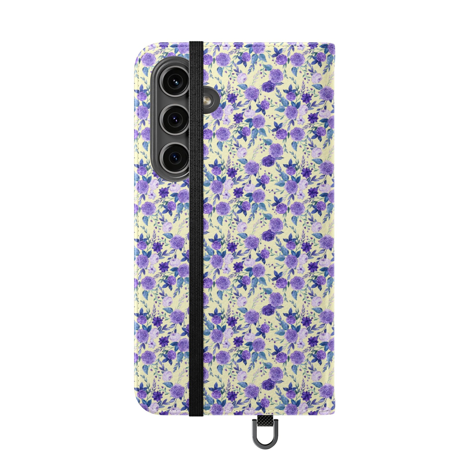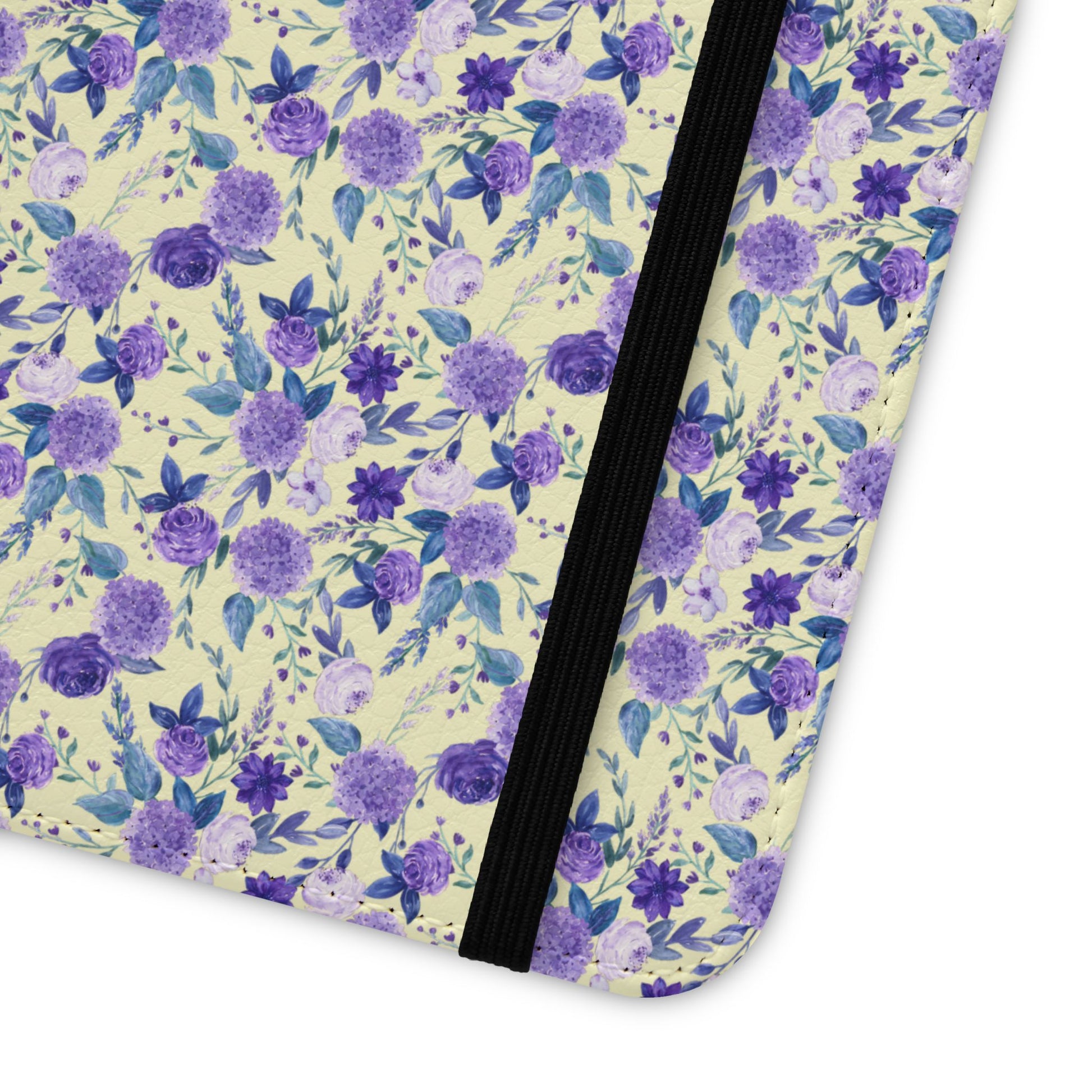 Violet phone cases with convenient compartments for cards and cash. Made from cruelty-free faux leather, perfect for adults. Features a D-ring for straps and stand for media viewing. Ideal for Samsung Galaxy models.