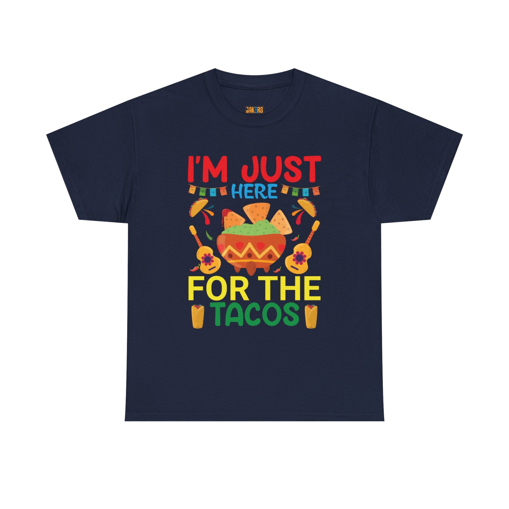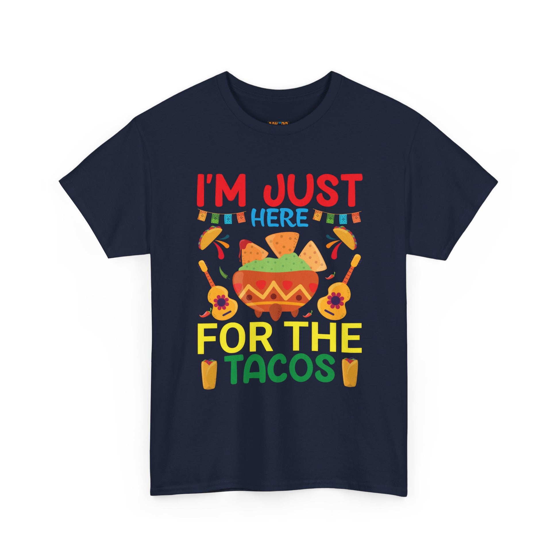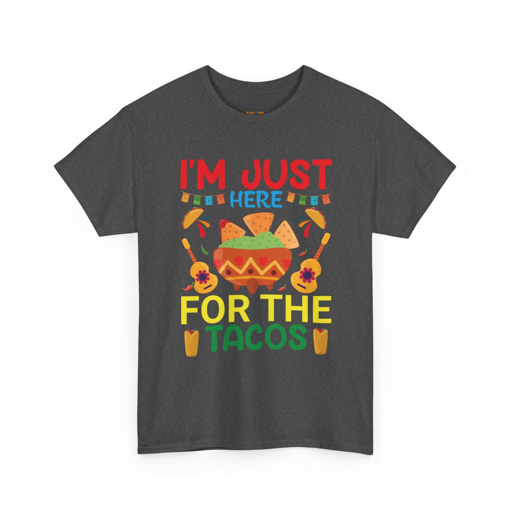 Funny Taco Lovers T-Shirt with the quote "I'm Just Here For The Tacos", perfect for taco enthusiasts looking for a bit of humor in their wardrobe. This unisex heavy cotton tee offers a comfy fit and is ideal for casual outings or lounging at home. Great for celebrating Taco Tuesday or Cinco de Mayo.