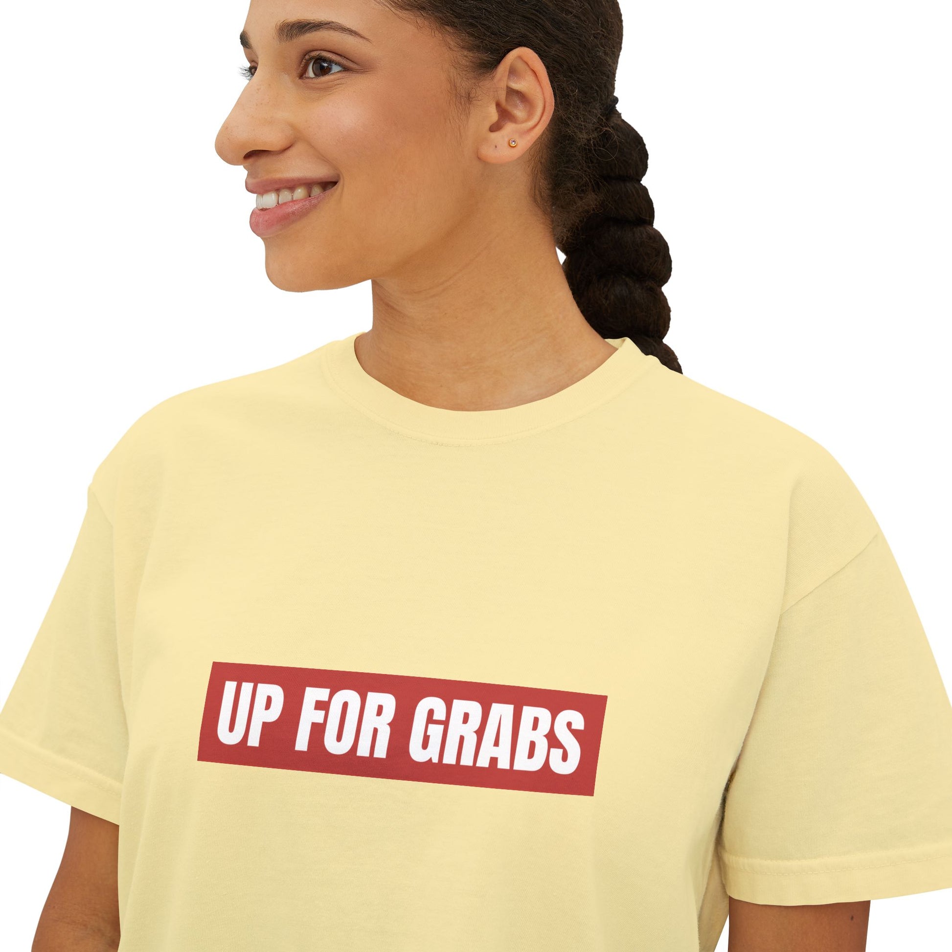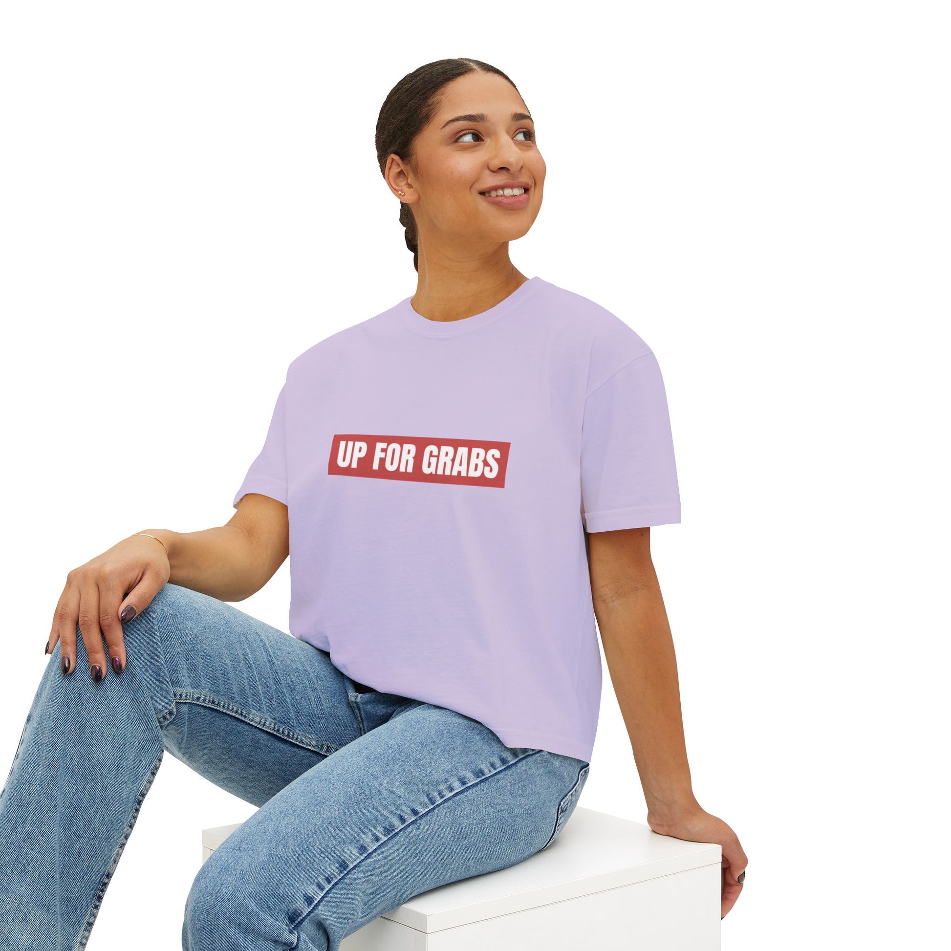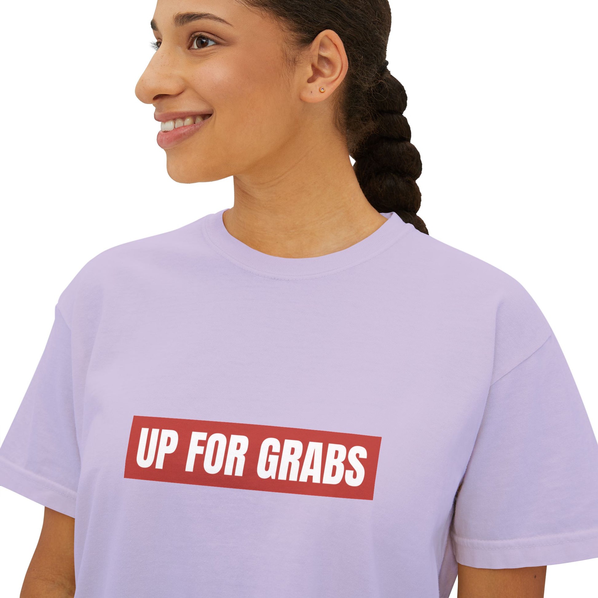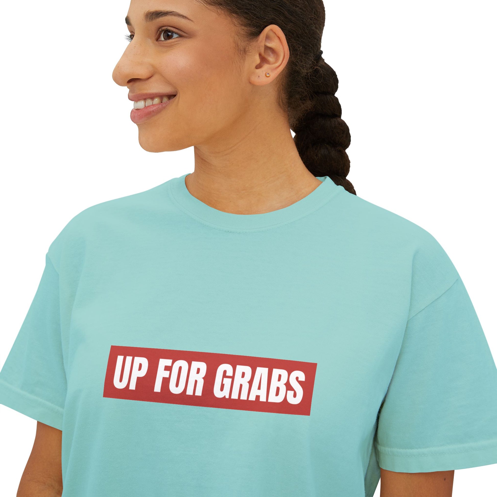 The "Up For Grabs" Boxy Tee is a fun and bold shirt that adds a playful touch to your wardrobe. Made from soft, breathable fabric, this boxy-fit tee offers a relaxed and comfortable silhouette, perfect for casual wear. Featuring a statement design, it’s ideal for anyone who loves to stand out and make a statement. Whether you're running errands or hanging out with friends, this tee is a great way to showcase your confident, fun-loving personality.