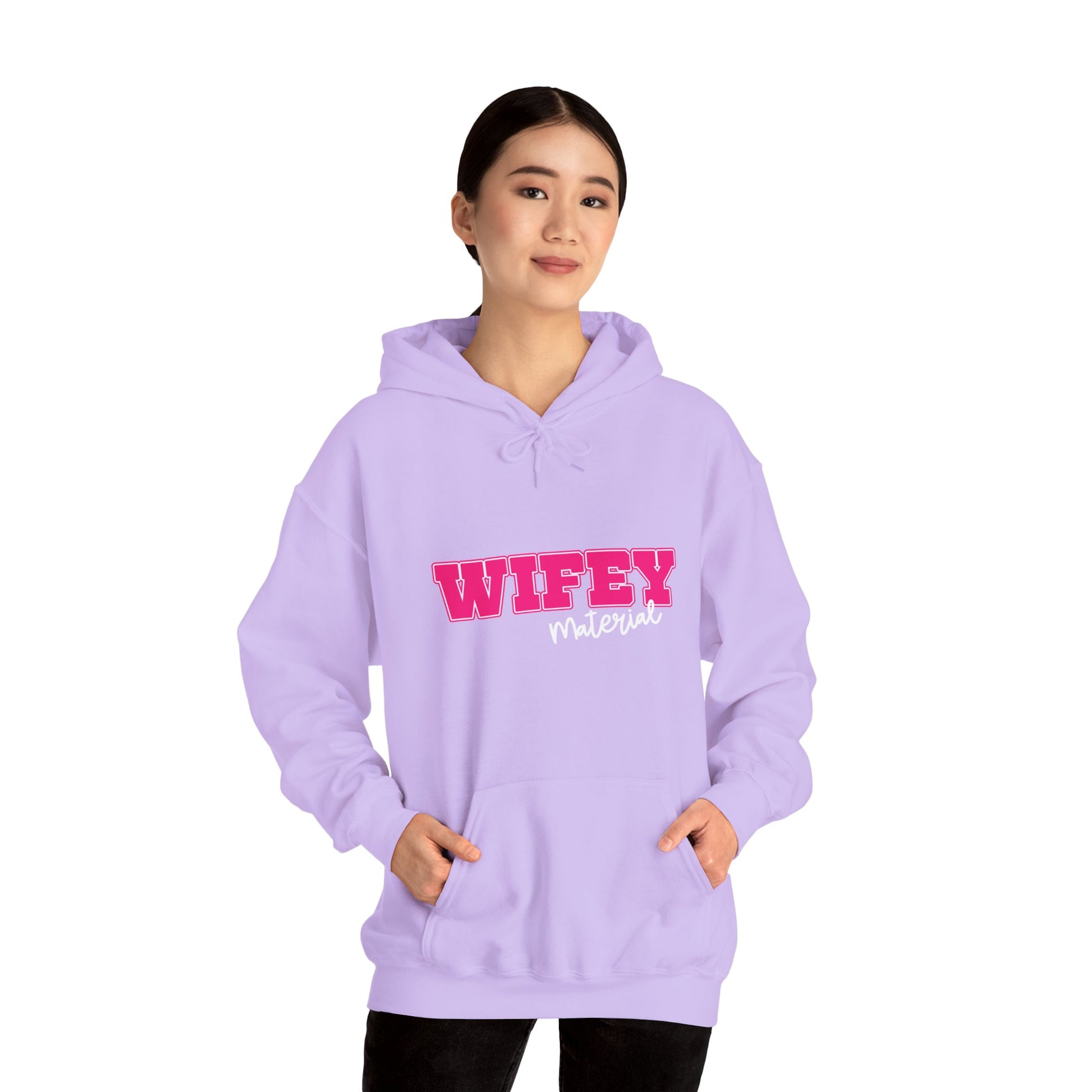 The "Wifey Material" Unisex Heavy Blend™ Hooded Sweatshirt is a fun and playful statement piece that combines comfort and style. Made from a soft, durable blend of cotton and polyester, this hoodie offers a cozy, relaxed fit that’s perfect for everyday wear. Featuring a bold and cheeky "Wifey Material" graphic, it’s ideal for those who love to show off their fun-loving and confident personality. Whether you're lounging at home or out with friends, this sweatshirt adds a touch of humor and warmth to your casual wardrobe.